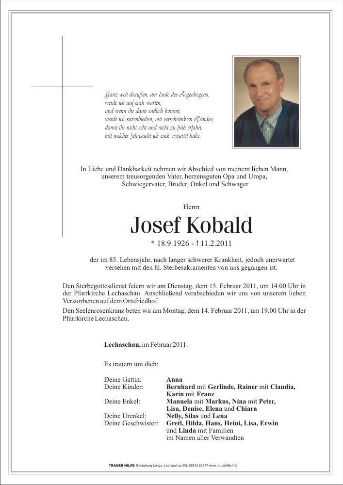 13.12.1901 11.02.2011 Lechaschau Josef Kobald Action Parte Sterbebild Gedenkkerzen Kondolenzen Jahrestag Parte Sterbebild Gedenkkerzen Kondolenzen Jahrestag Parte herunterladen Sterbebild herunterladen Gedenkkerzen für Josef Kobald 32 Einträge Kerze anzünden Wir denken an dich! ! Ein Osterlicht für dich Andrea Schweinzer Elmar Beirer Zum Geburtstag Zum Jahrestag für dich Andrea Schweinzer Erika Zum Jahrtag ein Adventslicht für dich Zum Geburtstag Zum Jahrtag für Dich Wir denken an Dich In lieber Erinnerung deine Elena In lieber Erinnerung deine Lisa Nelly und Silas Erika Ruhe in Frieden Denise Friederike m. Familie Nina und Peter Nelly und Silas Von deiner Enkelin Chiara Gerlinde u. Bernhard Ruhe in Frieden deine Anna von deiner Lisa Von deiner Enkelin Elena Karin u. Franz Fam. Günter und Gitti Muglach . . . unvergessen! Ihre Gedenkkerze fürJosef Kobald Ihr Name* Farbe auswählen Ihre Nachricht oder Name* E-Mail-Adresse* Mit dem Klicken auf "Kerze anzünden" erklären Sie sich mit unseren Datenschutzbestimmungen einverstanden. Kondolenzbuch für Josef Kobald 0 Einträge Kondolenz verfassen Ihr Abschiedsgruß an Josef Kobald Ihr Name* E-Mail-Adresse* Ihre Nachricht* Mit dem Klicken auf "Gruß absenden" erklären Sie sich mit unseren Datenschutzbestimmungen einverstanden. Jahrestag herunterladen