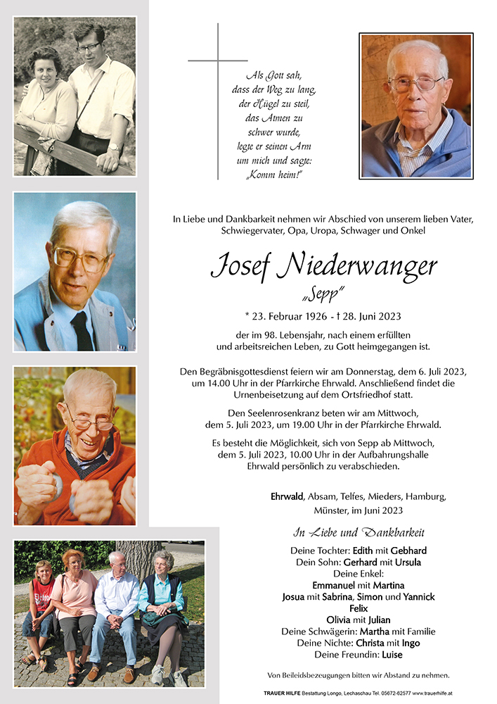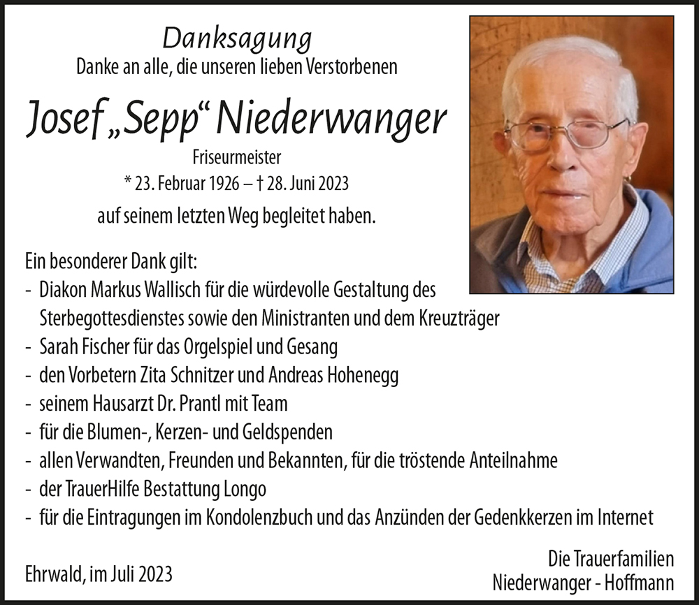 Sepp war für uns ein besonderer Mensch, er hat uns Gedichte geschrieben, und den Anhänger mit der Mutter Gottes werden wir in Ehren halten! Sepp war ein guter Chef für meine Schwester Ingrid, die damals die Lehre bei ihm gemacht hat. Herr und Frau Niederwanger waren Freunde meiner Mutter, Anni war Muttis beste Freundin. Auch vom Urlaub in Alassio zusammen mit " Niederwangers" , war für meine Mutter unvergesslich! Lieber Sepp, schlafe in Frieden!