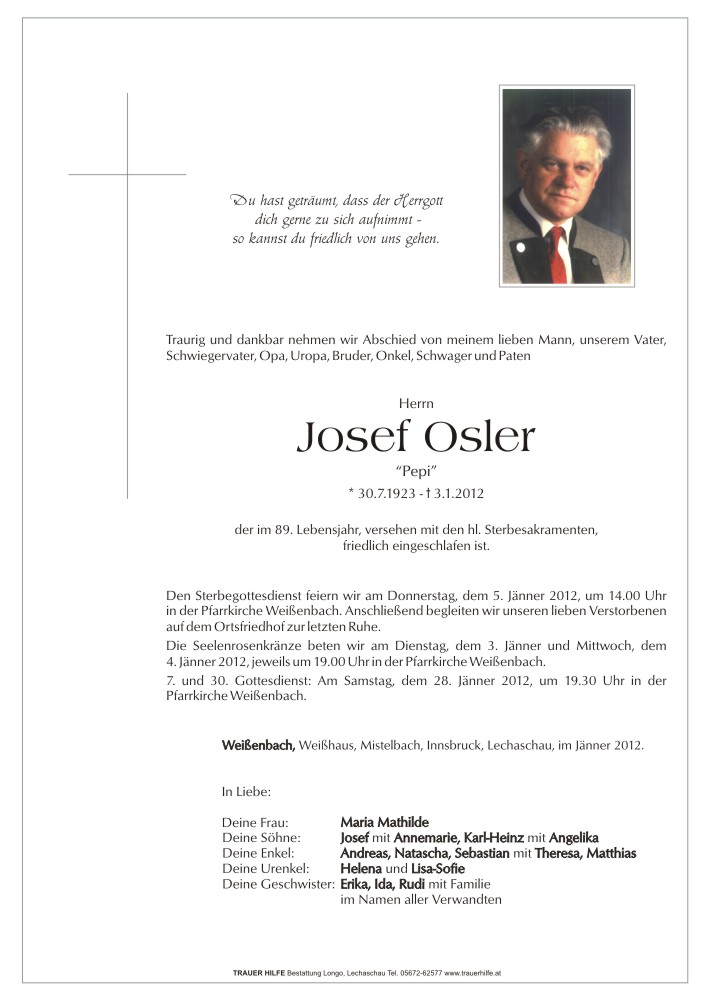 Unsere aufrichtige Anteilnahme lieber Josef, Annemarie, Andreas und Karla möchten wir euch überbringen.