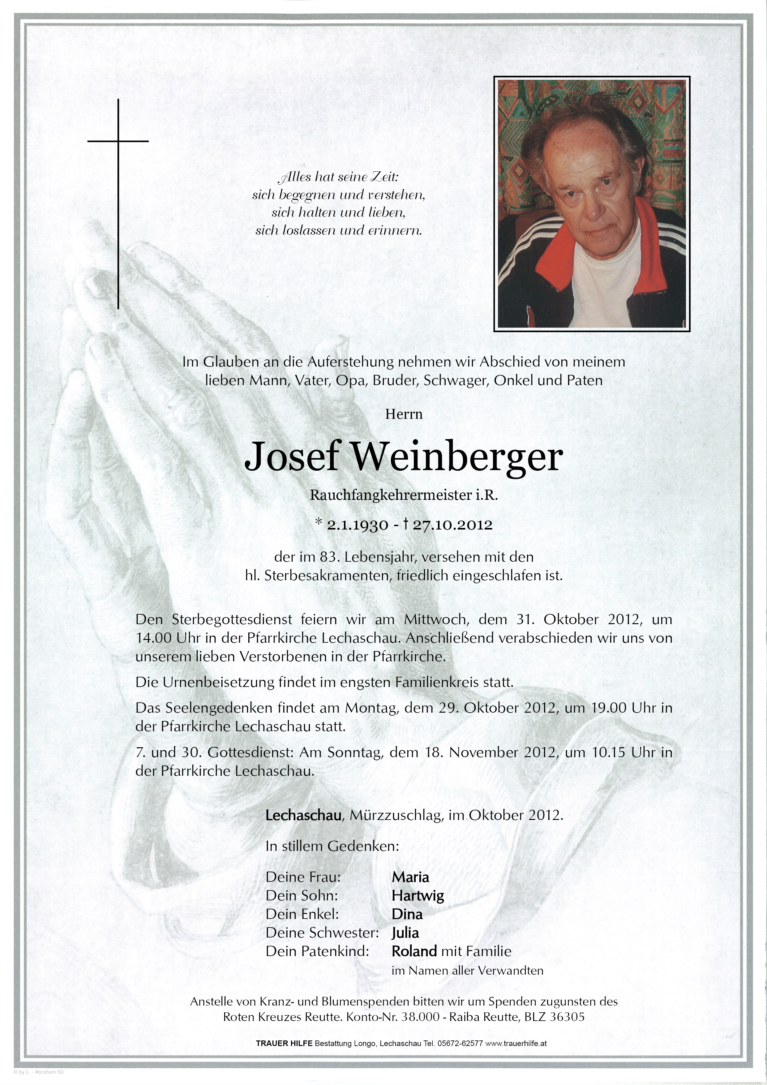 Seid nicht traurig, dass Josef zu seinem letzten Weg, seinem Herrn und Schöpfer aufgebrochen ist. Freut Euch, dass er so lange bei Euch sein durfte und konnte.