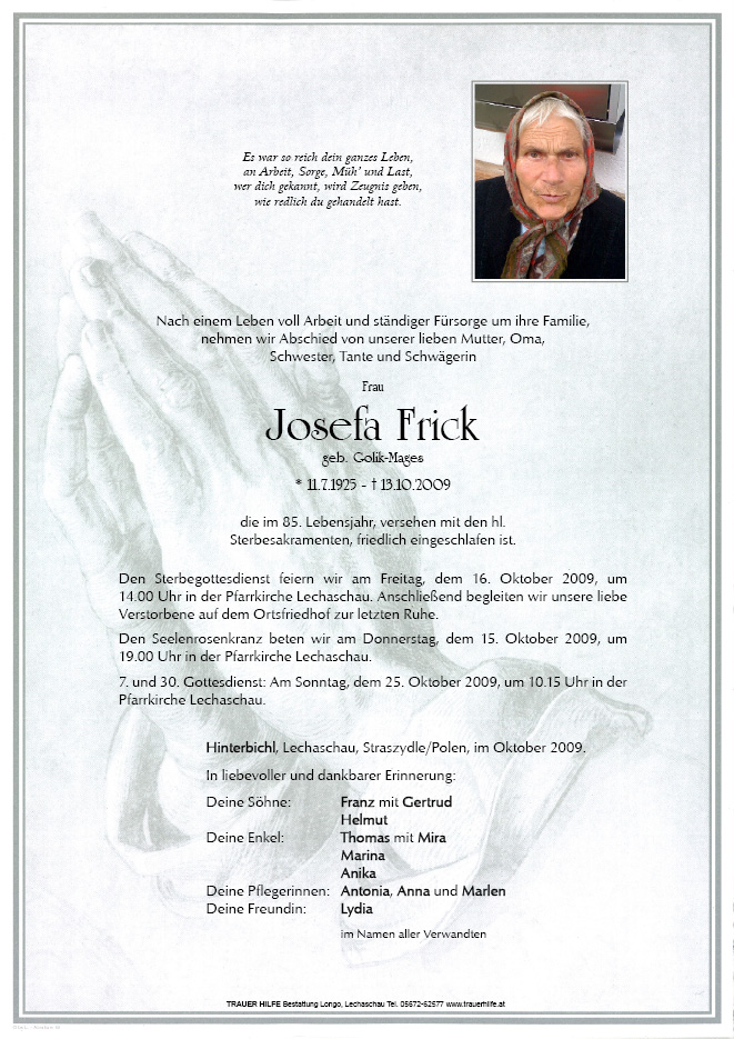 13.12.1901 13.10.2009 Hinterbichl Josefa Frick Action Parte Gedenkkerzen Kondolenzen Parte Gedenkkerzen Kondolenzen Parte herunterladen Gedenkkerzen für Josefa Frick 27 Einträge Kerze anzünden Genowefa Smolik/Golik i Krzysztof Smolik Osterkerzle für di ! Neujahr 2024 Allerheiligen 2023 IM GEDENKEN IM GEDENKEN Allerheiligen 2021 Deine ehemalige Nachbarin M. Die Erinnerung bleibt-unvergessen Marlen Gedenkkerze Gedenkkerze 2021 Marlen Weihnachtslicht 2020 Adventlicht für dich, Sefa IN LIEBER ERINNERUNG Marlen Tommy IN GOTTES HAND GEBORGEN Ruhe in Frieden lb. Seffa Dein Thomas Dein Thomas Ruhe in Frieden ! Frohe Weihnachten lb. Oma ! Für Oma Dein Thomas Never forget - Tommy R. I. P Dein Thomas Denk´an dich ! Ihre Gedenkkerze fürJosefa Frick Ihr Name* Farbe auswählen Ihre Nachricht oder Name* E-Mail-Adresse* Mit dem Klicken auf "Kerze anzünden" erklären Sie sich mit unseren Datenschutzbestimmungen einverstanden. Kondolenzbuch für Josefa Frick 0 Einträge Kondolenz verfassen Ihr Abschiedsgruß an Josefa Frick Ihr Name* E-Mail-Adresse* Ihre Nachricht* Mit dem Klicken auf "Gruß absenden" erklären Sie sich mit unseren Datenschutzbestimmungen einverstanden.