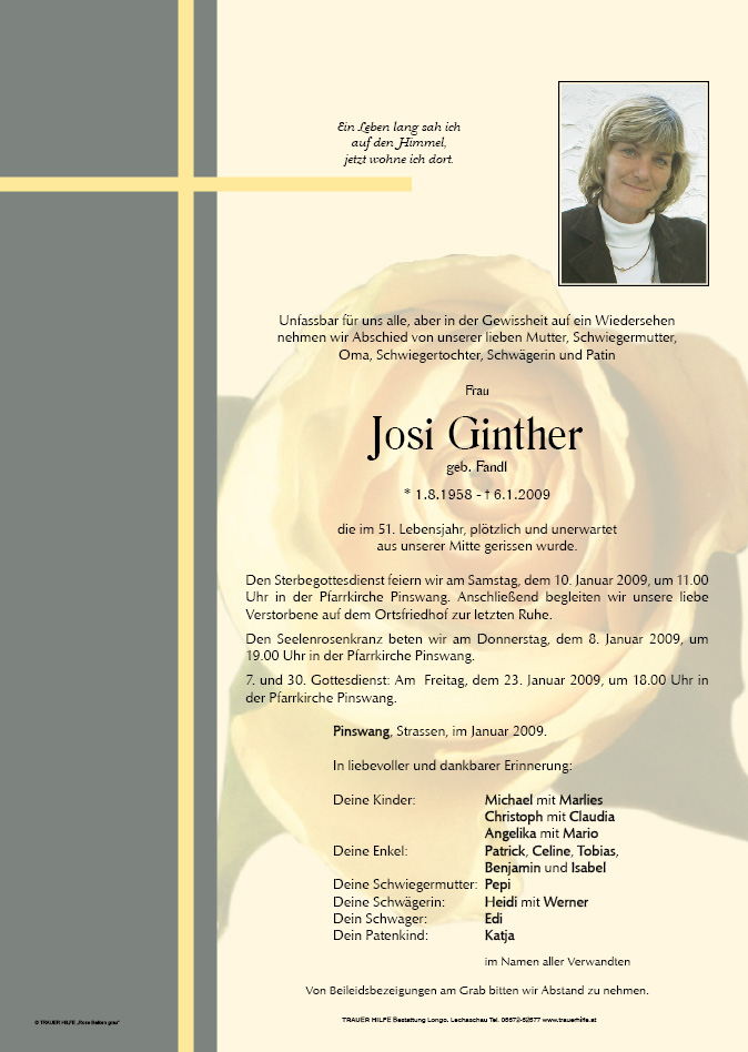 13.12.1901 06.01.2009 Pinswang Josi Ginther Action Parte Gedenkkerzen Kondolenzen Parte Gedenkkerzen Kondolenzen Parte herunterladen Gedenkkerzen für Josi Ginther 20 Einträge Kerze anzünden Elmar Michael Linda Michael zum Sterbeandenken. . . Linda ein stiller Gruß - Linda ein stiller Gruß Linda ein stiller Gruß - Linda Marlies, Tobias, Benjamin für dich und deine Lieben mit lieben Grüßen - Linda Linda du fehlst uns ein Weihnachtsliachtle ein stiller Gruß - Linda Marlies Michael Tobi Beni ein stiller Gruß - Linda du fehlst uns so sehr Marlies und Michael Linda Ihre Gedenkkerze fürJosi Ginther Ihr Name* Farbe auswählen Ihre Nachricht oder Name* E-Mail-Adresse* Mit dem Klicken auf "Kerze anzünden" erklären Sie sich mit unseren Datenschutzbestimmungen einverstanden. Kondolenzbuch für Josi Ginther 0 Einträge Kondolenz verfassen Ihr Abschiedsgruß an Josi Ginther Ihr Name* E-Mail-Adresse* Ihre Nachricht* Mit dem Klicken auf "Gruß absenden" erklären Sie sich mit unseren Datenschutzbestimmungen einverstanden.