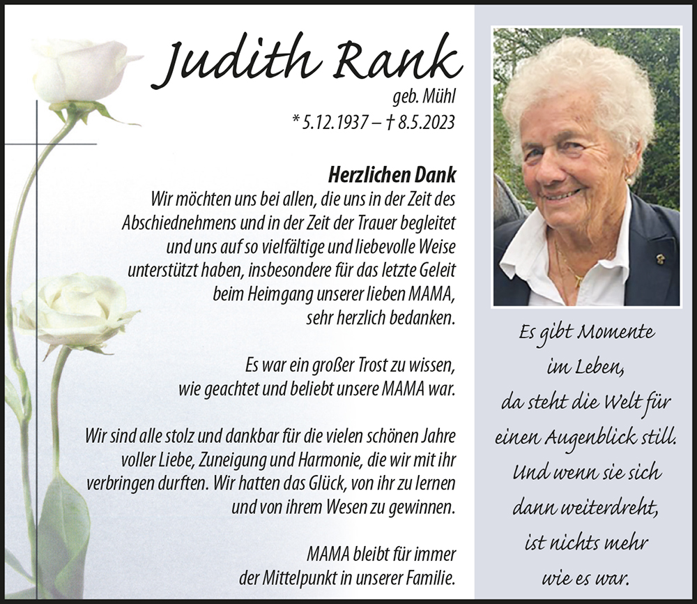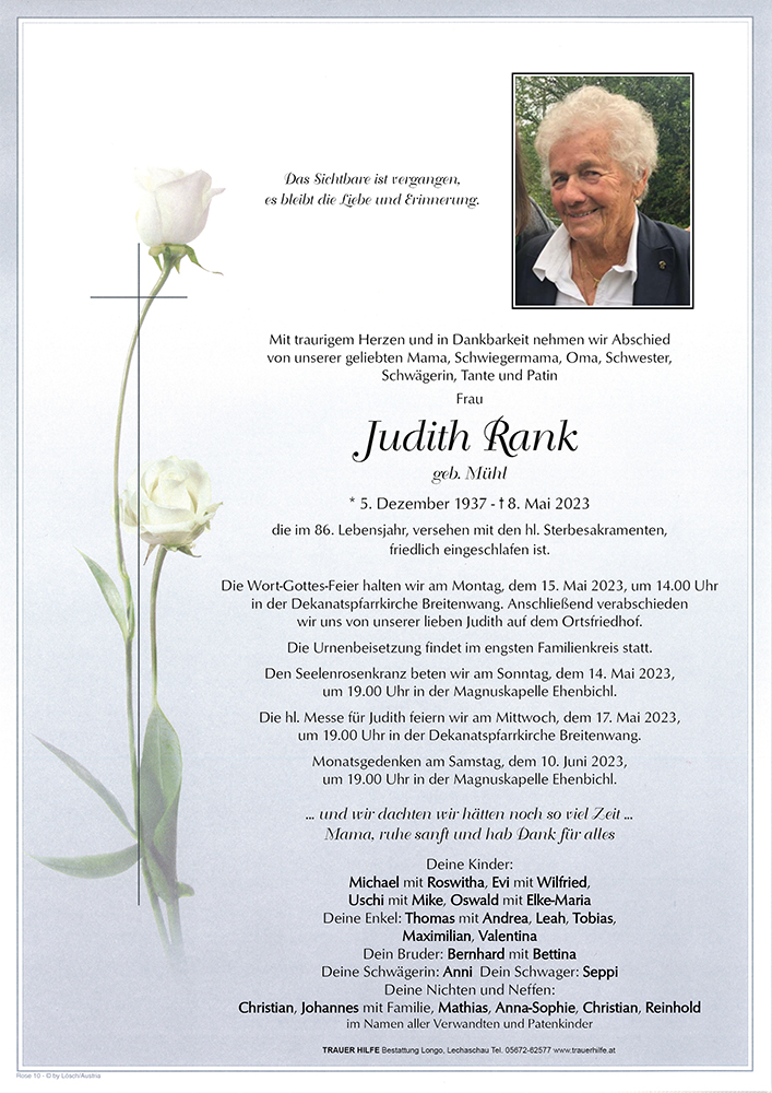 Judith, Du warst uns über viele Jahrzehnte eine liebe und angenehme Nachbarin, wir werden Dich stets in guter Erinnerung behalten. Der Hergott möge Dir Alles, was Du für Deine Familie und Deine Mitmenschen getan hast reichlich lohnen.