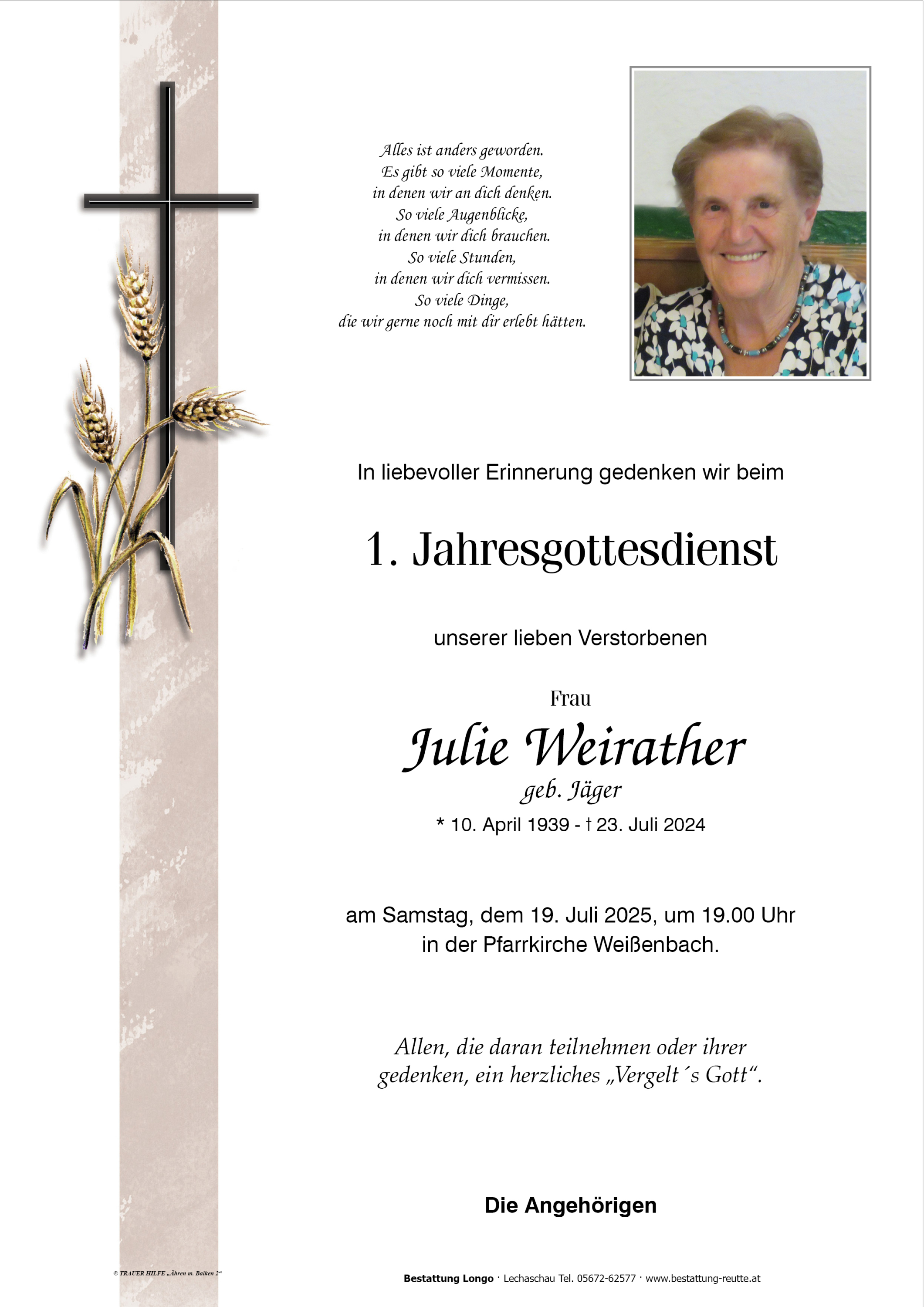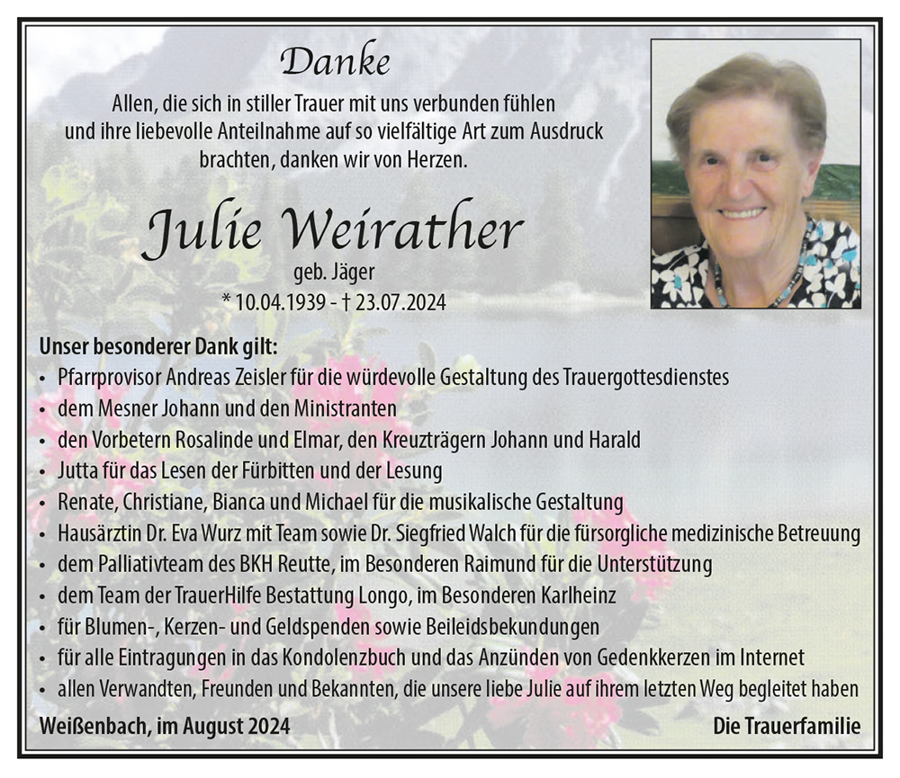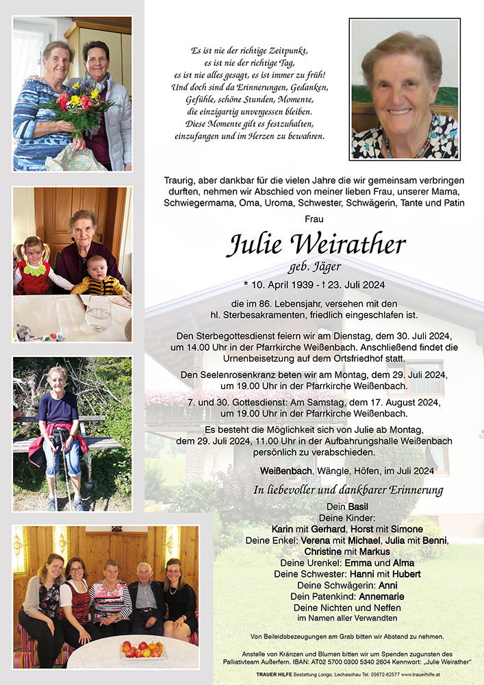 Die OG Weissenbach des österr. Pensionistenverbandes möchte zum Heimgang von Julie das herzlichste Beileid aussprechen.