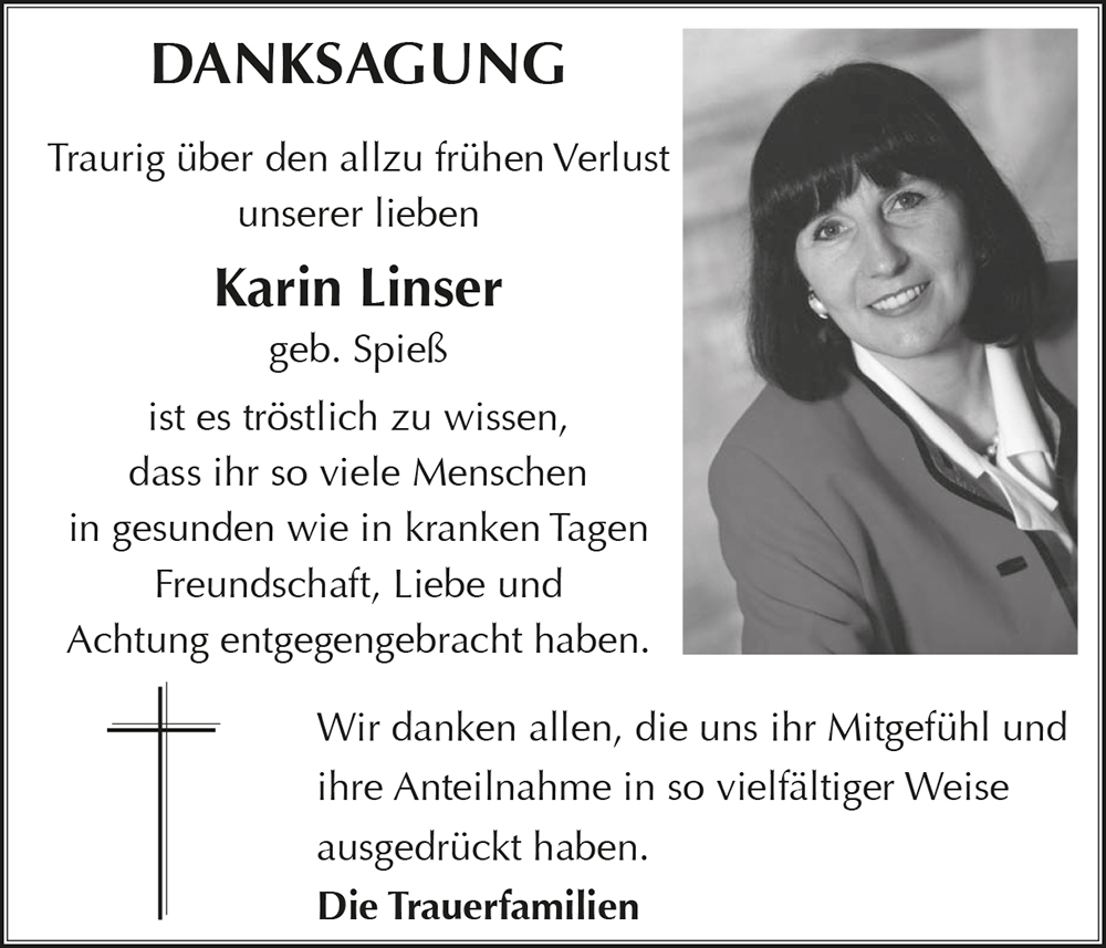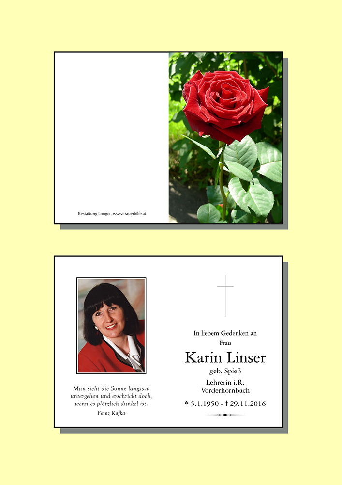 Eure liebevolle, treusorgende Mama, unsere liebe Karin hat ihr Tagwerk vollendet und in Gottes Hände gelegt.
