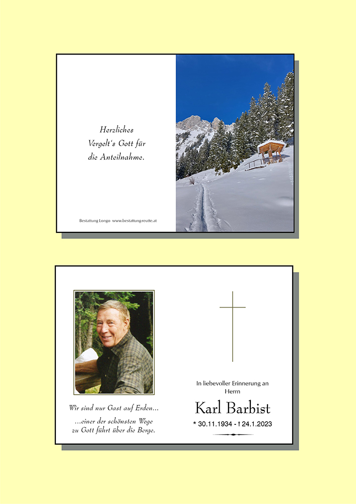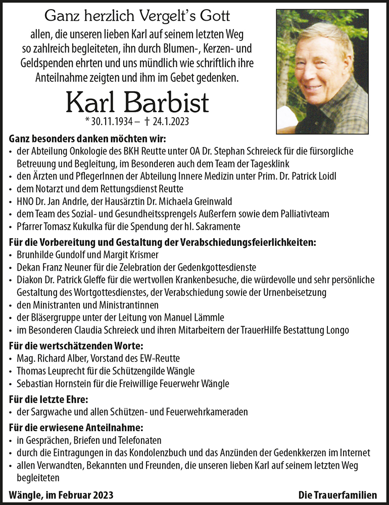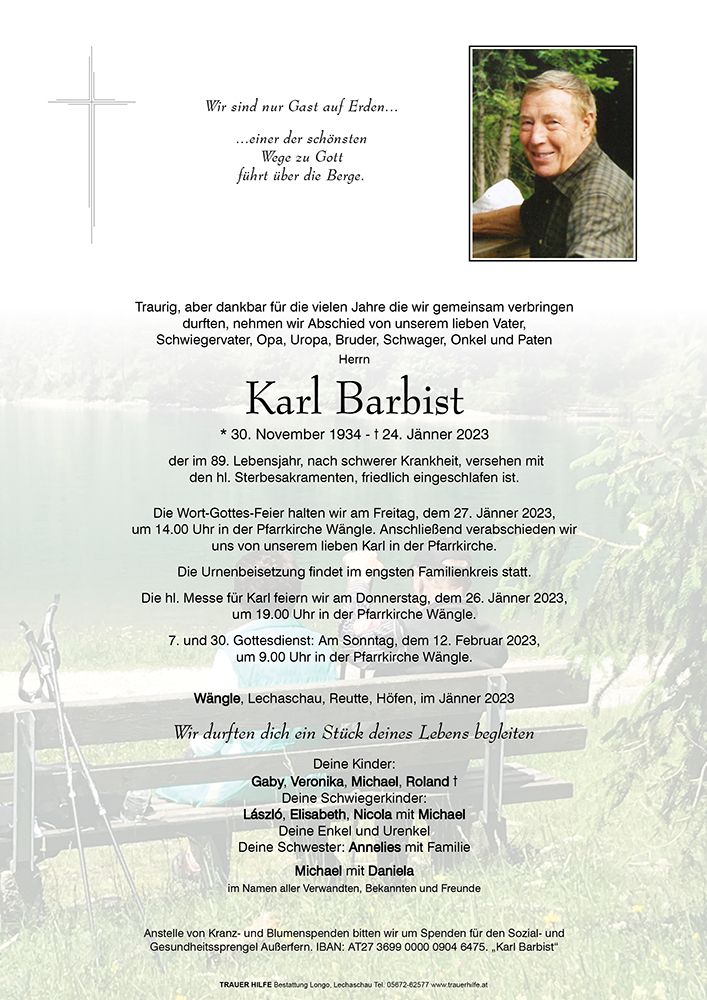 Leider ist es uns aus gesundheitlichen Gründen nicht möglich, beim letzten Weg, den Karl gehen muss, dabei zu sein.
