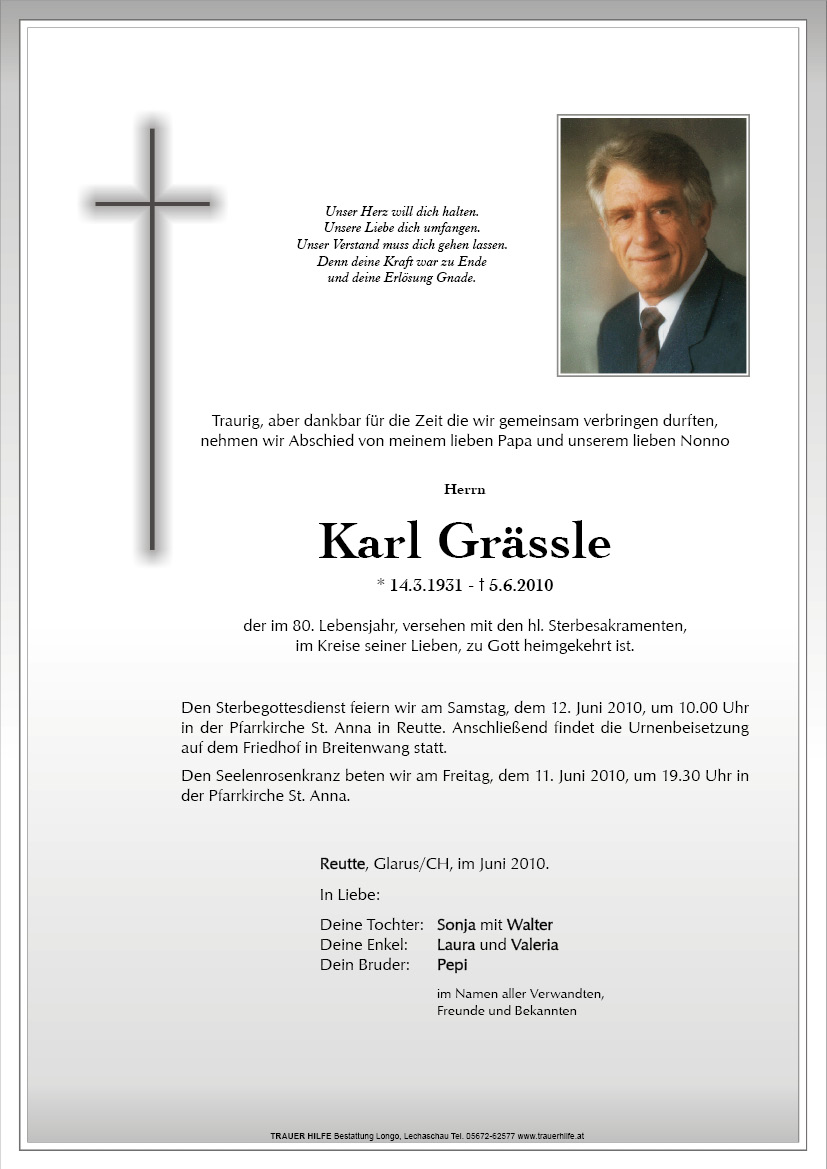 13.12.1901 05.06.2010 Reutte Karl Grässle Action Parte Sterbebild Gedenkkerzen Kondolenzen Parte Sterbebild Gedenkkerzen Kondolenzen Parte herunterladen Sterbebild herunterladen Gedenkkerzen für Karl Grässle 9 Einträge Kerze anzünden Zum 10. Jahresgedenken! Du fehlst. . . Du fehlst. . . Eine Osterkerze! Wir denken an dich! In bleibender Erinnerung! In stillem Gedenken! Für Dich! Du fehlst uns! Ihre Gedenkkerze fürKarl Grässle Ihr Name* Farbe auswählen Ihre Nachricht oder Name* E-Mail-Adresse* Mit dem Klicken auf "Kerze anzünden" erklären Sie sich mit unseren Datenschutzbestimmungen einverstanden. Kondolenzbuch für Karl Grässle 0 Einträge Kondolenz verfassen Ihr Abschiedsgruß an Karl Grässle Ihr Name* E-Mail-Adresse* Ihre Nachricht* Mit dem Klicken auf "Gruß absenden" erklären Sie sich mit unseren Datenschutzbestimmungen einverstanden.