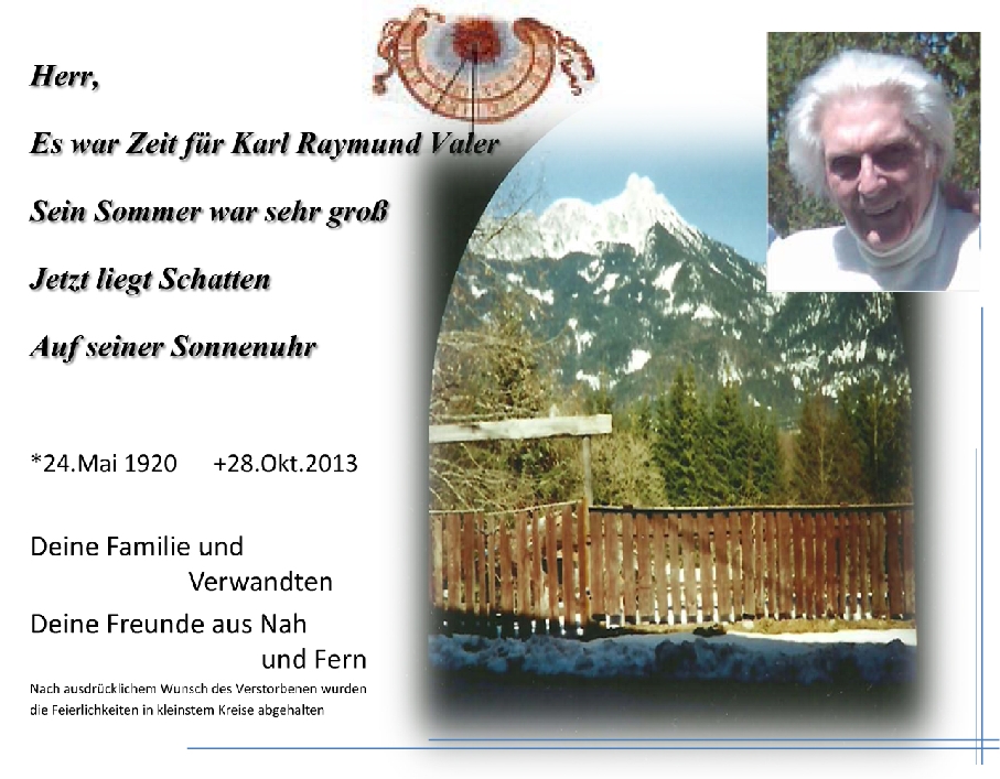 Ihr Gatte erreichte ein hohes Alter und er hinterlässt sicher viele Geschichten, die sein Leben schrieb. So dürfen wir alle zuversichtlich darauf vertrauen, dass der Schatten auf seiner Sonnenuhr wieder weicht und gute Erinnerungen freigibt, damit die Zeit darauf nicht stehen bleibt.