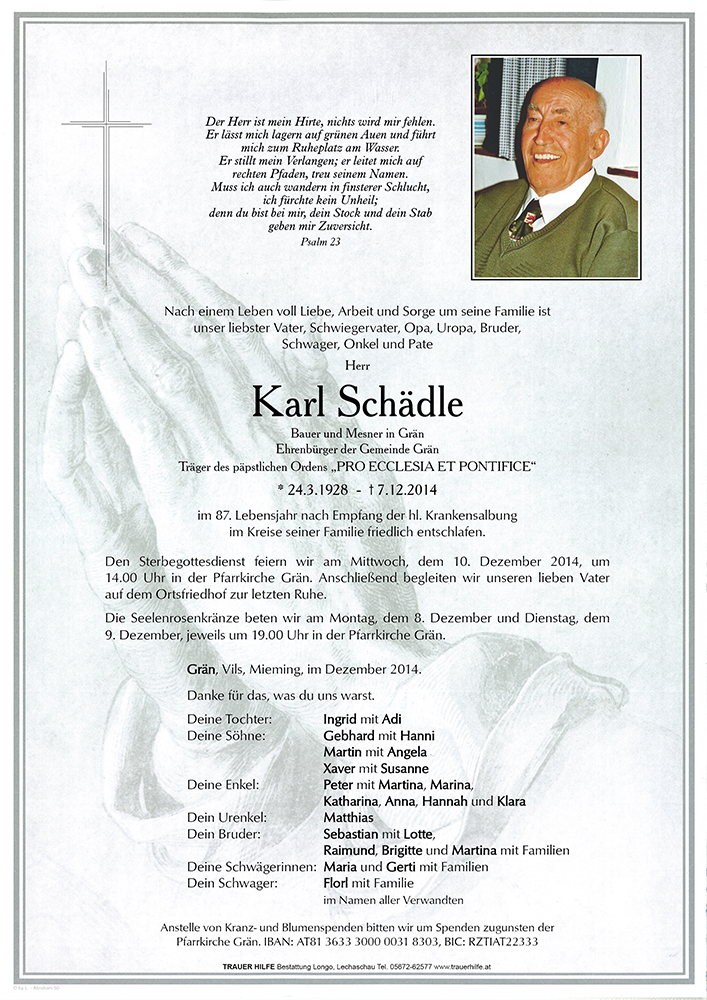 Ich konnte mich am Samstag dank meiner Schwester Hanni von Karl verabschieden, werde seinen Händedruck und sein Lächeln nicht vergessen. Danke !