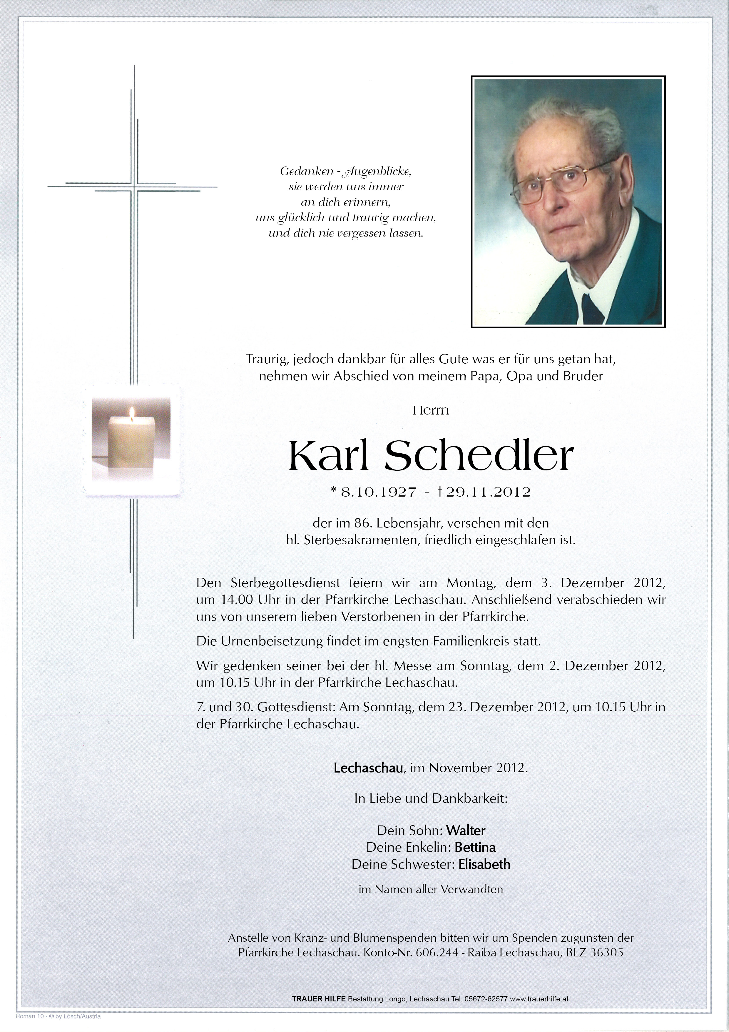 Gedenkkerzen für Karl Schedler