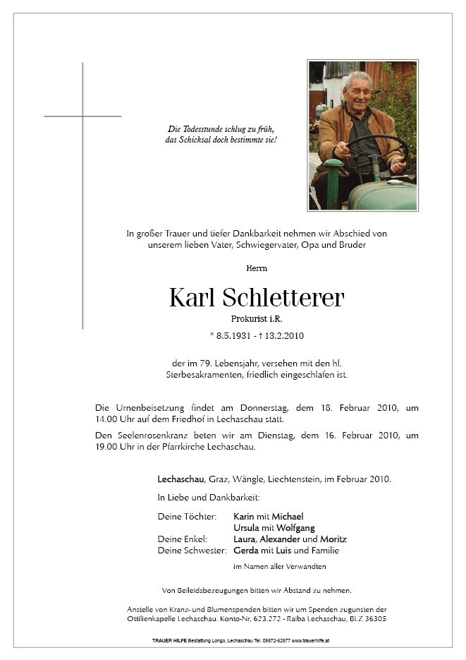 13.12.1901 13.02.2010 Lechaschau Karl Schletterer Action Parte Sterbebild Gedenkkerzen Kondolenzen Danksagung Parte Sterbebild Gedenkkerzen Kondolenzen Danksagung Parte herunterladen Sterbebild herunterladen Gedenkkerzen für Karl Schletterer 3 Einträge Kerze anzünden Elmar Beirer Ruhe in Frieden Josef und Walburga Dürrhammer Ihre Gedenkkerze fürKarl Schletterer Ihr Name* Farbe auswählen Ihre Nachricht oder Name* E-Mail-Adresse* Mit dem Klicken auf "Kerze anzünden" erklären Sie sich mit unseren Datenschutzbestimmungen einverstanden. Kondolenzbuch für Karl Schletterer 0 Einträge Kondolenz verfassen Ihr Abschiedsgruß an Karl Schletterer Ihr Name* E-Mail-Adresse* Ihre Nachricht* Mit dem Klicken auf "Gruß absenden" erklären Sie sich mit unseren Datenschutzbestimmungen einverstanden. Danksagung herunterladen