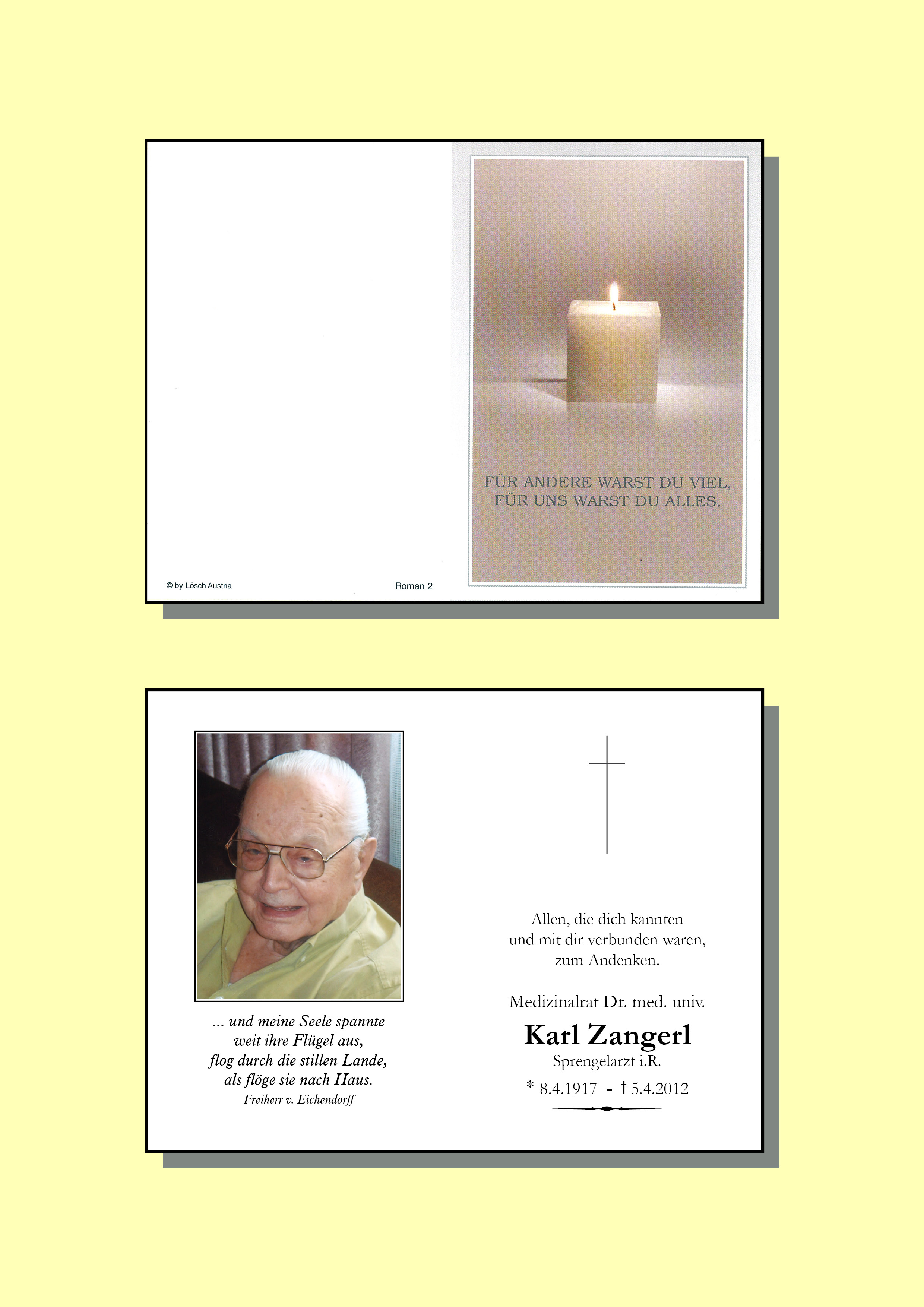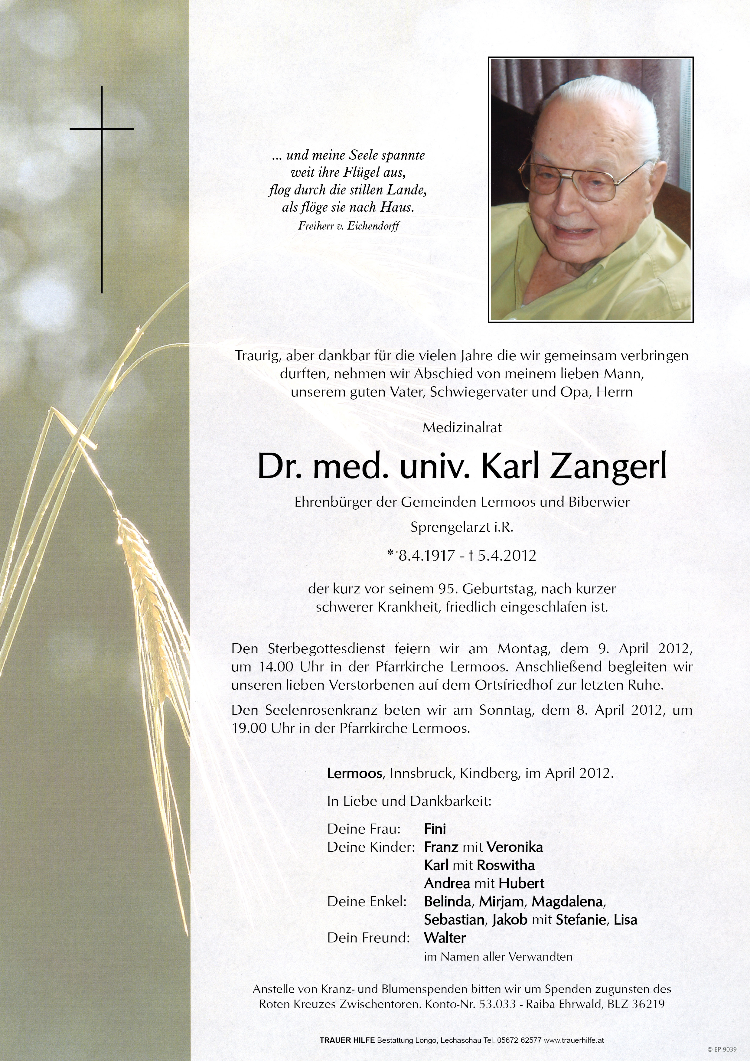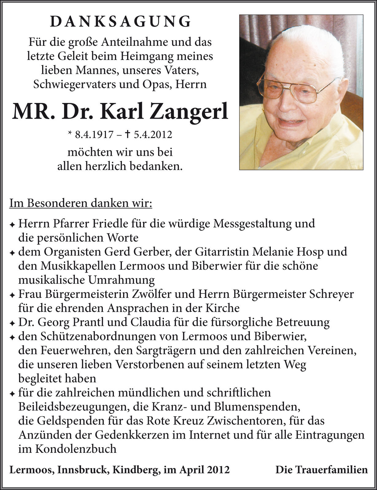 Dr. Zangerl wird mir immer in Erinnerung bleiben so wie er sich auch nach vielen Jahren immer an mich erinnert hat. Ein Arzt mit Herz und Verstand.