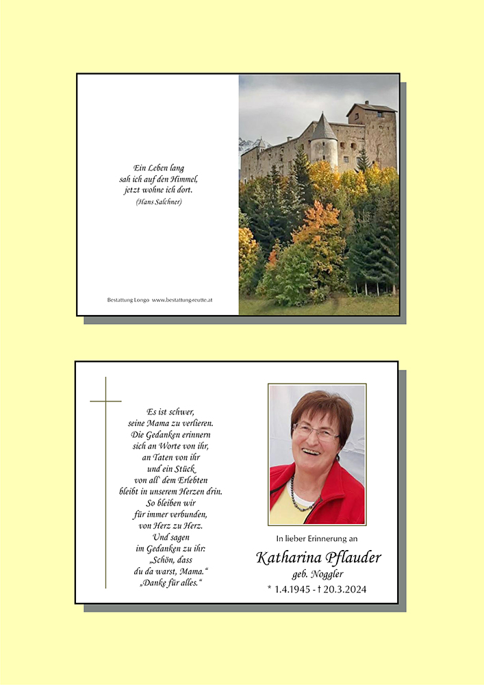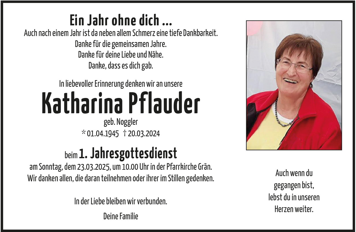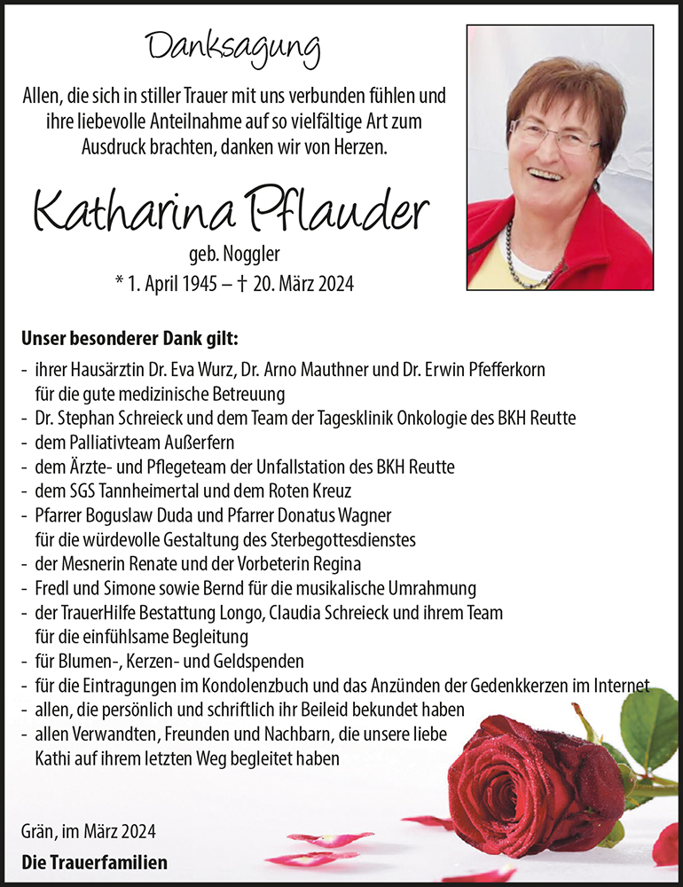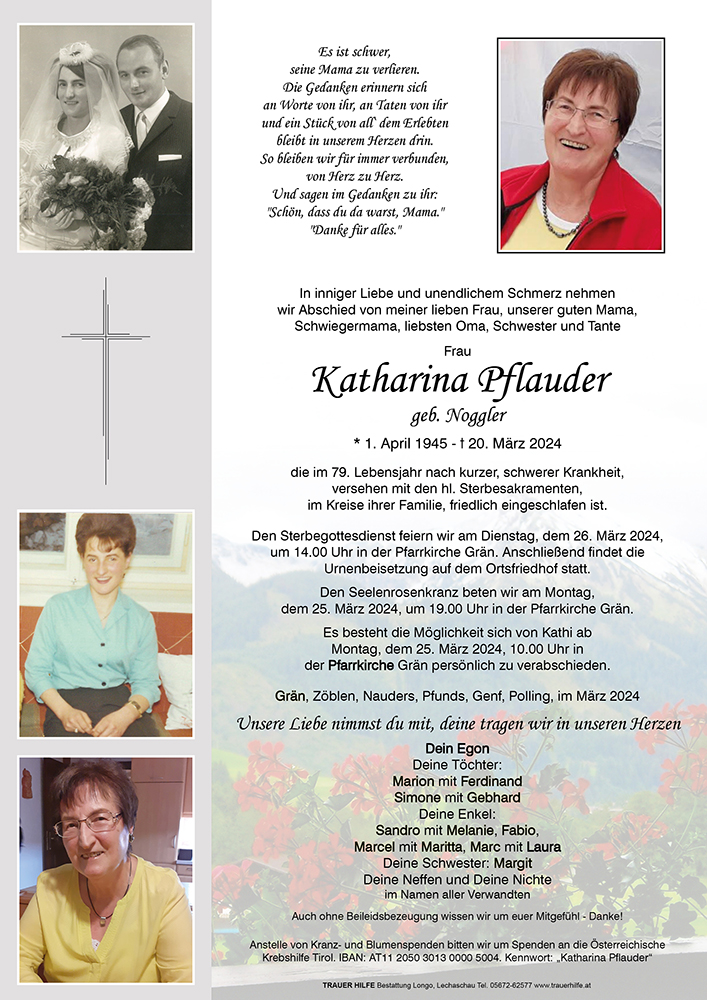 Lieber Herr Pflauder, liebe Marion mit Familie und liebe Simone mit Familie, so viele Jahre habe ich mit meinen Eltern und meiner Schwester Urlaub bei Ihnen/euch gemacht. Seit vielen Jahren komme ich im Sommer nach Grän und verfolge immer noch, was so passiert. So hat es mich so traurig gemacht als ich vom Tod Ihrer Frau und eurer Mutter erfahren habe. Ich habe sie als so wundervolle, herzensgute Frau in Erinnerung. Es ist wohl der letzte Liebesdienst, den man erweisen kann, wenn man loslässt und ihr die Ruhe gönnt. Ich umarme Sie/euch und wünsche euch viel Kraft ? Martina (geb. Löffler)