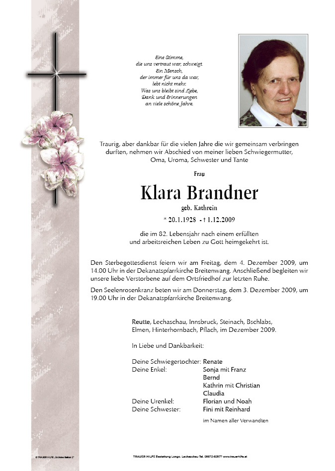 13.12.1901 01.12.2009 Reutte Klara Brandner Action Parte Gedenkkerzen Kondolenzen Parte Gedenkkerzen Kondolenzen Parte herunterladen Gedenkkerzen für Klara Brandner 1 Eintrag Kerze anzünden Gitti mit Familie Ihre Gedenkkerze fürKlara Brandner Ihr Name* Farbe auswählen Ihre Nachricht oder Name* E-Mail-Adresse* Mit dem Klicken auf "Kerze anzünden" erklären Sie sich mit unseren Datenschutzbestimmungen einverstanden. Kondolenzbuch für Klara Brandner 0 Einträge Kondolenz verfassen Ihr Abschiedsgruß an Klara Brandner Ihr Name* E-Mail-Adresse* Ihre Nachricht* Mit dem Klicken auf "Gruß absenden" erklären Sie sich mit unseren Datenschutzbestimmungen einverstanden.