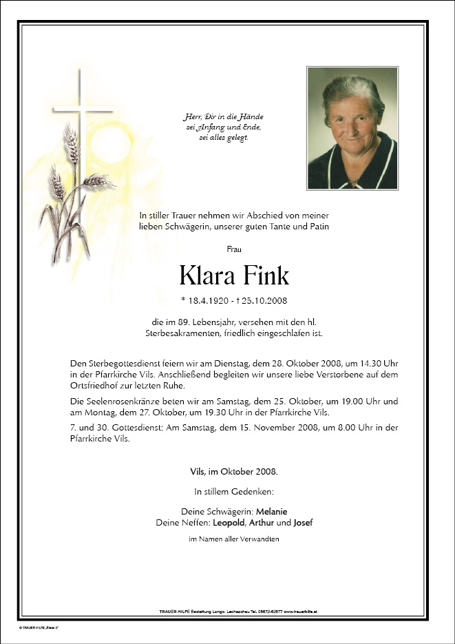 13.12.1901 25.10.2008 Vils Klara Fink Action Parte Gedenkkerzen Kondolenzen Parte Gedenkkerzen Kondolenzen Parte herunterladen Gedenkkerzen für Klara Fink 0 Einträge Kerze anzünden Ihre Gedenkkerze fürKlara Fink Ihr Name* Farbe auswählen Ihre Nachricht oder Name* E-Mail-Adresse* Mit dem Klicken auf "Kerze anzünden" erklären Sie sich mit unseren Datenschutzbestimmungen einverstanden. Kondolenzbuch für Klara Fink 0 Einträge Kondolenz verfassen Ihr Abschiedsgruß an Klara Fink Ihr Name* E-Mail-Adresse* Ihre Nachricht* Mit dem Klicken auf "Gruß absenden" erklären Sie sich mit unseren Datenschutzbestimmungen einverstanden.