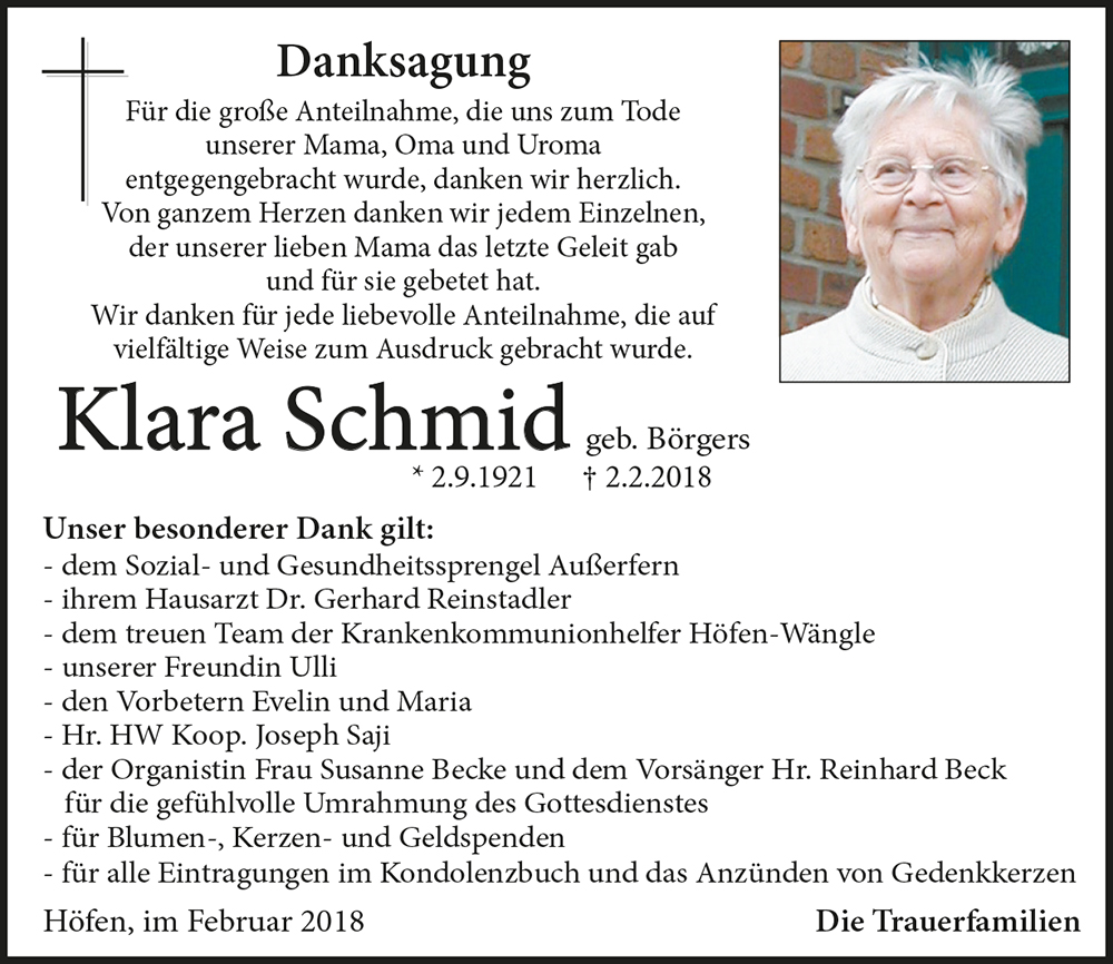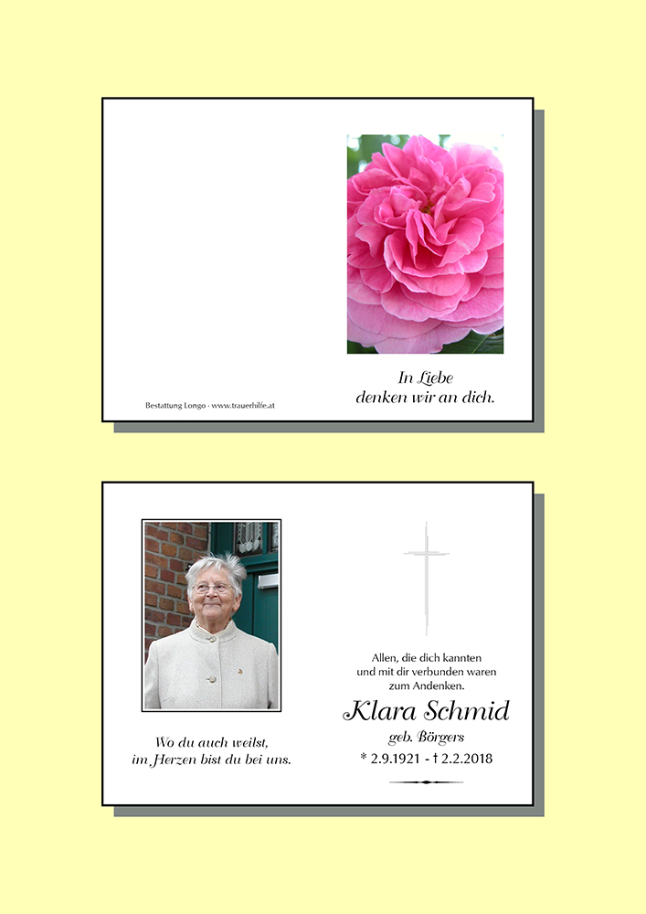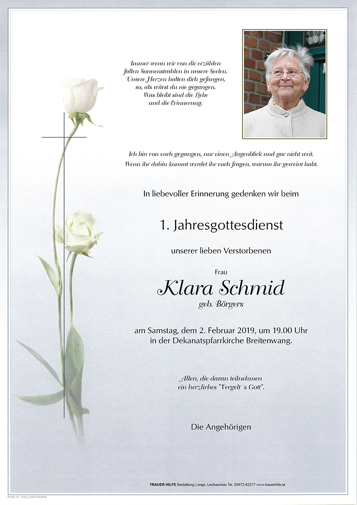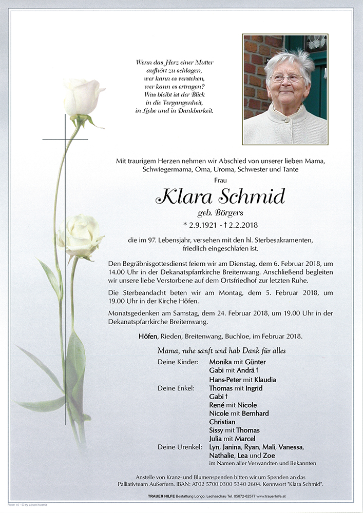 herzliche Anteilnahme zur Erlösung von Frau Schmid Klara, sie ist nicht gestorben sondern nur Voraus gegangen. Ruhe in Frieden!