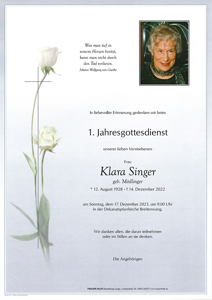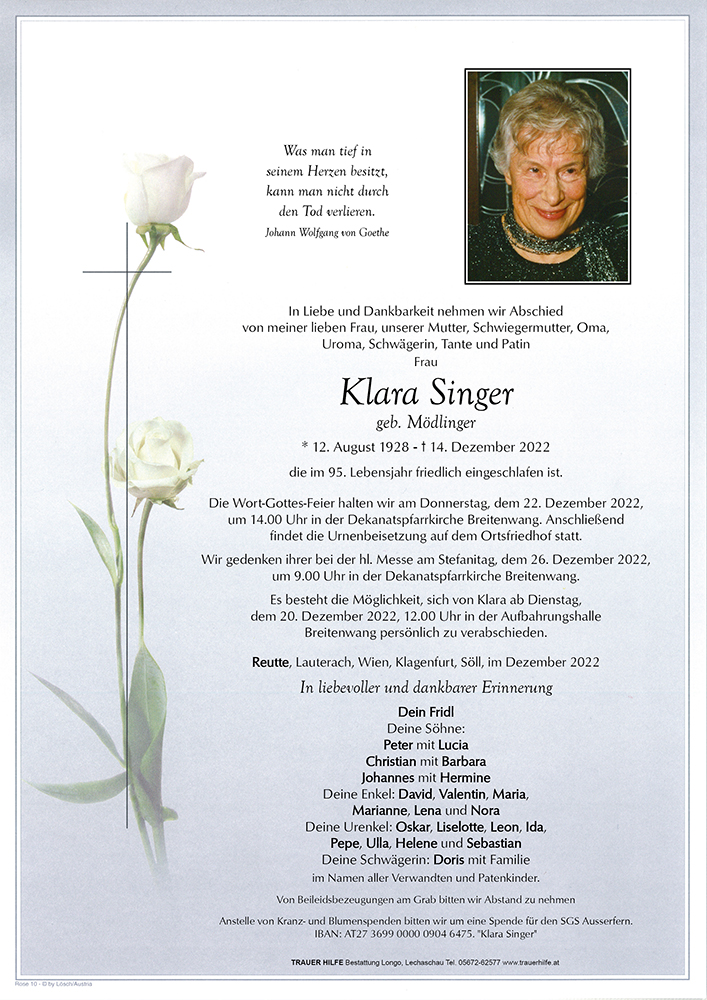 Lieber Fridl und Familien! Wir hatten mit Klara seit Tennis- und Zeitungszeiten eine nette Verbindung. Die jahrzehnte lange Nachbarschaft am Wolfsberg zeugte von liebevoller Achtung. Mein Mitgefühl und die Erinnerung an meine Nachbarin soll dir und deinen Lieben Trost sein.