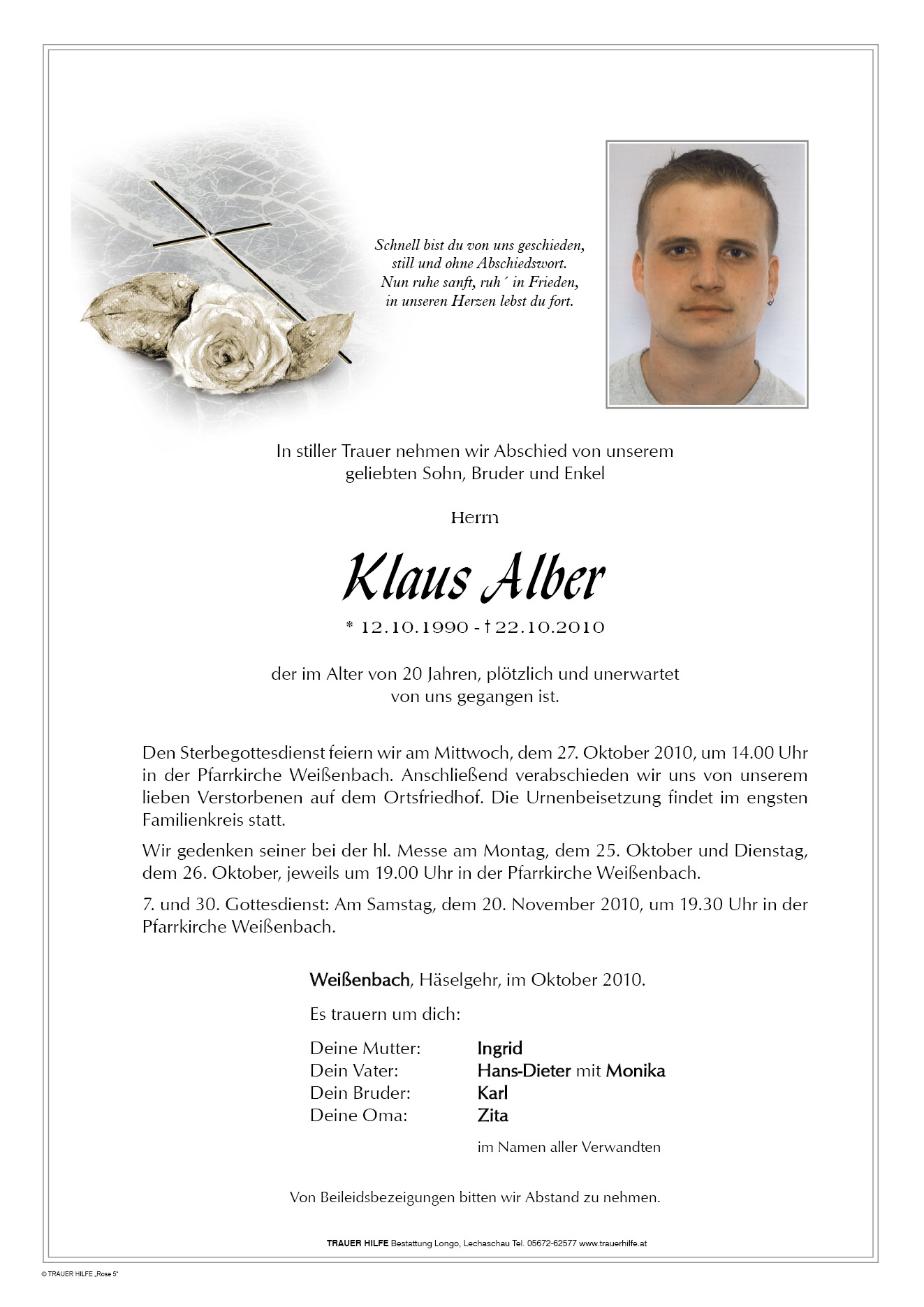 13.12.1901 22.10.2010 Weißenbach am Lech Klaus Alber Action Parte Sterbebild Gedenkkerzen Kondolenzen Parte Sterbebild Gedenkkerzen Kondolenzen Parte herunterladen Sterbebild herunterladen Gedenkkerzen für Klaus Alber 20 Einträge Kerze anzünden RIP denk noch oft an dich! stefan Lilli & Walter Lageder Fam. Sonnweber Günther Für dich gerne denken wir an di Ew. Fried. Freud PoschIngrid m. F Bettina, Pia und Martin Jürgen Fam. Kerle Wbch. Jürgen FÜR DICH Ein Licht für Dich SEMPER FIDELIS tempus fugit - amor manet mir denken oft an di missU soo much In stiller Erinnerung in amore aeterna Ingrid Posch und Kinder Wbch. Ihre Gedenkkerze fürKlaus Alber Ihr Name* Farbe auswählen Ihre Nachricht oder Name* E-Mail-Adresse* Mit dem Klicken auf "Kerze anzünden" erklären Sie sich mit unseren Datenschutzbestimmungen einverstanden. Kondolenzbuch für Klaus Alber 0 Einträge Kondolenz verfassen Ihr Abschiedsgruß an Klaus Alber Ihr Name* E-Mail-Adresse* Ihre Nachricht* Mit dem Klicken auf "Gruß absenden" erklären Sie sich mit unseren Datenschutzbestimmungen einverstanden.