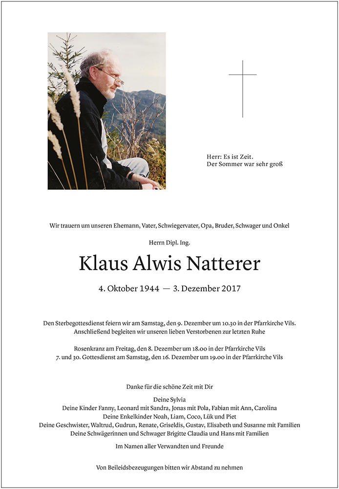 mit großer Freude und liebevoller Erinnerung denke ich zurück an die vielen spannenden Gespräche und Begegnungen mit Klaus, an Treffen in Vils, Reutte und Breitenwang, an Kinoabende und Ausstellungen. Ich wünsche Euch viel Kraft in neuen Zeiten. Ich danke Klaus, dass er