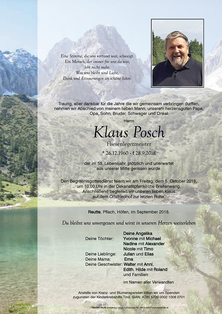 es tut uns wahnsinnig leid, dass Klaus dein Mann und eurer Papa so früh aus dem Familienkreis gerissen wurde. Wir wünschen Euch von ganzen Herzen viel Kraft und Zuversicht. In deinen Kindern Angelika, und in euren Enkeln lebt Klaus weiter. Sie sind es die dir und euch Trost geben werden, in der schweren Zeit des Verlustes.