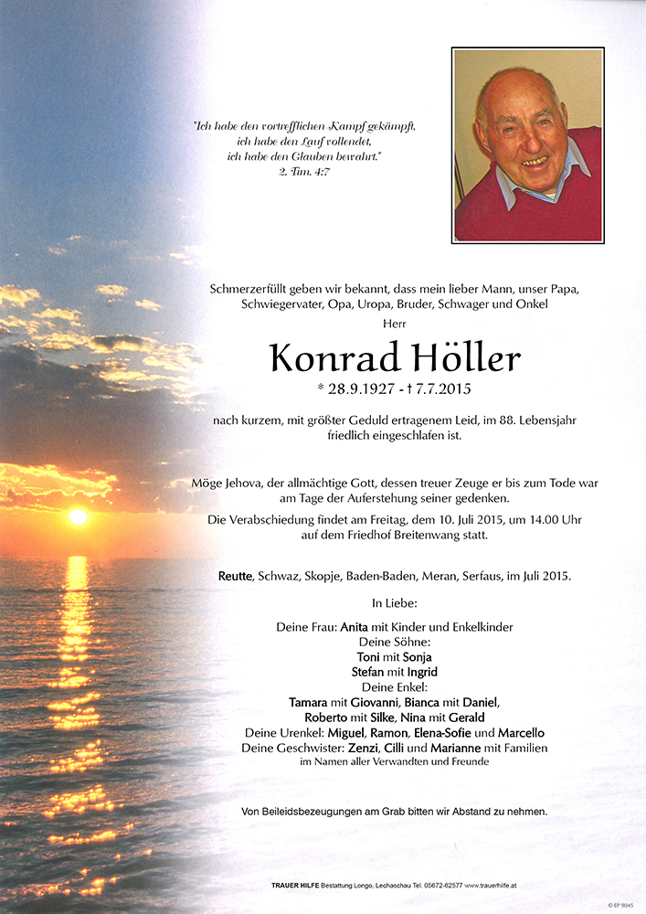 Liebe Frau Höller ! Wir möchten Ihnen und Ihrer Familie unsere aufrichtige Anteilnahme aussprechen. Anton und Brigitte Illmer