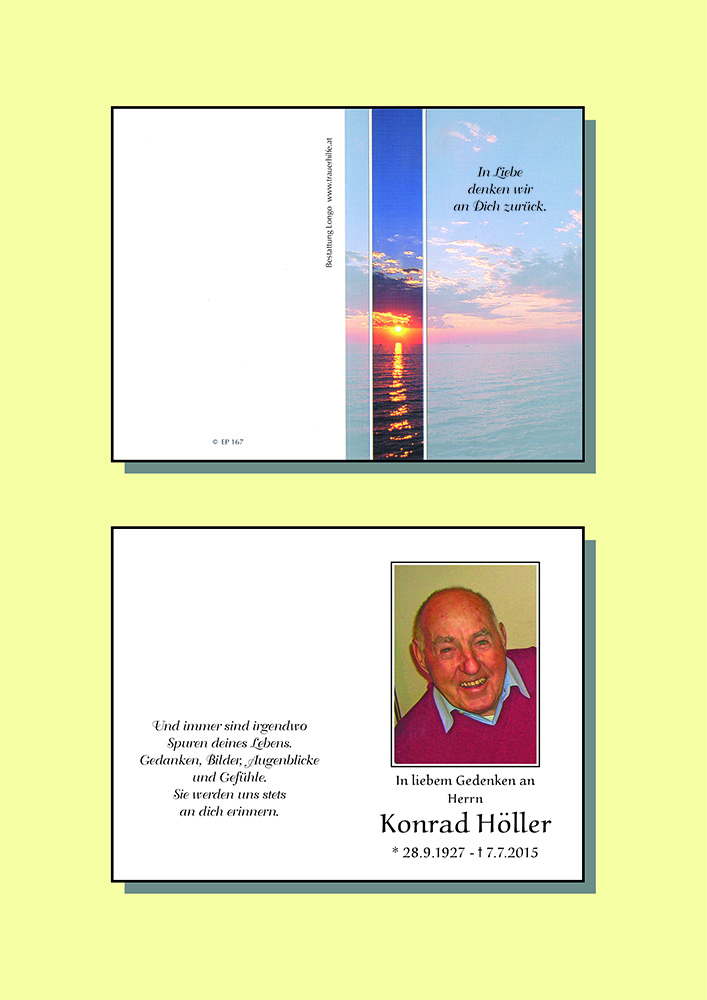 In tiefer Dankbarkeit für die vielen schönen Stunden, die ich mit Konrad und den "Seinen" verbringen durfte, trauere ich mit Euch und wünsche Euch allen viel Kraft in dieser schweren Zeit! Konrad hat sehr viel für andere Menschen getan und seinen Weg in seiner christlichen Lauterkeit beharren beendet! Wir alle freuen uns auf ein Wiedersehen mit ihm in der Auferstehung!