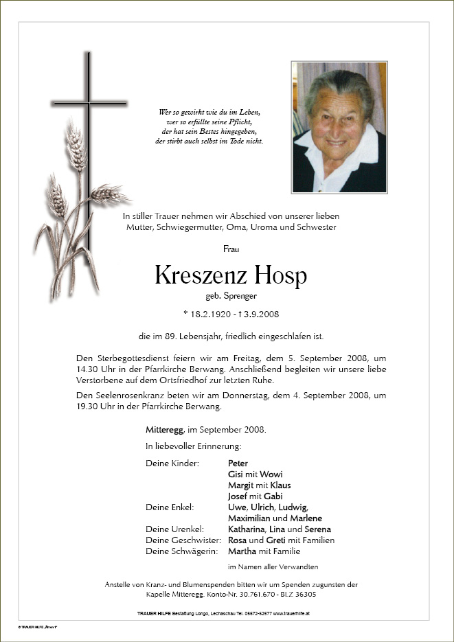 13.12.1901 03.09.2008 Mitteregg Kreszenz Hosp Action Parte Gedenkkerzen Kondolenzen Parte Gedenkkerzen Kondolenzen Parte herunterladen Gedenkkerzen für Kreszenz Hosp 0 Einträge Kerze anzünden Ihre Gedenkkerze fürKreszenz Hosp Ihr Name* Farbe auswählen Ihre Nachricht oder Name* E-Mail-Adresse* Mit dem Klicken auf "Kerze anzünden" erklären Sie sich mit unseren Datenschutzbestimmungen einverstanden. Kondolenzbuch für Kreszenz Hosp 0 Einträge Kondolenz verfassen Ihr Abschiedsgruß an Kreszenz Hosp Ihr Name* E-Mail-Adresse* Ihre Nachricht* Mit dem Klicken auf "Gruß absenden" erklären Sie sich mit unseren Datenschutzbestimmungen einverstanden.