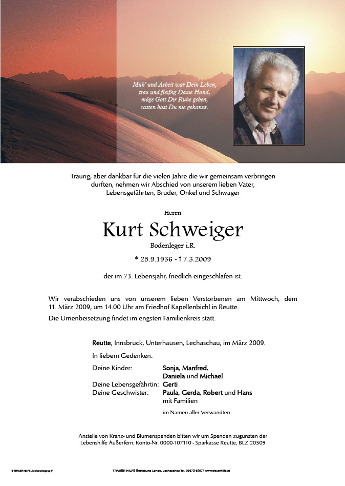 13.12.1901 07.03.2009 Reutte Kurt Schweiger Action Parte Gedenkkerzen Kondolenzen Parte Gedenkkerzen Kondolenzen Parte herunterladen Gedenkkerzen für Kurt Schweiger 5 Einträge Kerze anzünden Ein Licht für die Ewigkeit! Ruhe sanft in Gottes Hand! DAS EWIGE LICHT LEUCHTE DIR In lieber Erinnerung Elmar Beirer Ihre Gedenkkerze fürKurt Schweiger Ihr Name* Farbe auswählen Ihre Nachricht oder Name* E-Mail-Adresse* Mit dem Klicken auf "Kerze anzünden" erklären Sie sich mit unseren Datenschutzbestimmungen einverstanden. Kondolenzbuch für Kurt Schweiger 0 Einträge Kondolenz verfassen Ihr Abschiedsgruß an Kurt Schweiger Ihr Name* E-Mail-Adresse* Ihre Nachricht* Mit dem Klicken auf "Gruß absenden" erklären Sie sich mit unseren Datenschutzbestimmungen einverstanden.