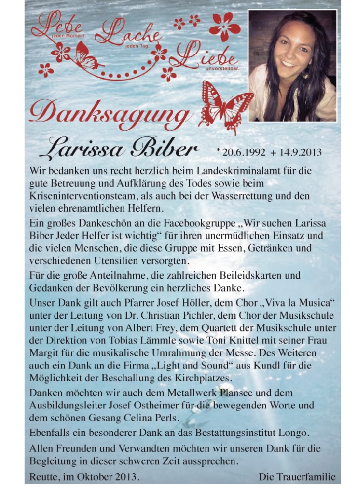 Ich bin eine mutter von drei kindern alles jung,ich bin aus neustift im stubeital aber was eurer tochter Larissa passiert ist ist für mich ein wahnsinn ich kenne euch überhaubt nicht aber das mit Larissa berührt mich heute noch jeden tag ich hoffe das ihr irgenwann euren frieden findet