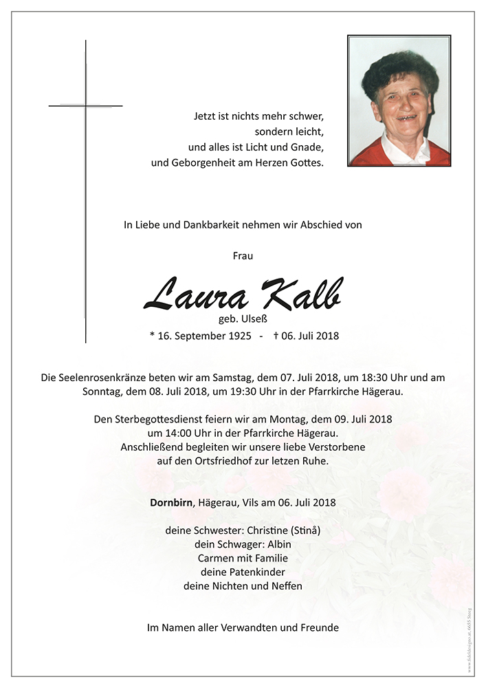 16.09.1925 06.07.2018 Hägerau Laura Kalb Action Parte Sterbebild Gedenkkerzen Kondolenzen Parte Sterbebild Gedenkkerzen Kondolenzen Parte herunterladen Sterbebild herunterladen Gedenkkerzen für Laura Kalb 36 Einträge Kerze anzünden . . . habs fein im Himmel ! Berta Walch Senioren Häselgehr Ursula Pohler Fritz und Edeltaud Familie Christine Oberforcher Walter Ulseß Benni & Sabine Nicole und Thomas Berta u. Günther mit Familie Waltraud und Artur Angelika Ulsess mit Kinder Moosbrugger Ehenbichl Walter und Belinda mit Kinder Vera mit Marina Manuela und Sepp Schedler Fam. Daniela Fidel Pfefferkorn Dein Patenkind Monika mit Fami Daniela Blaas RUHE IN FRIEDEN A KERZE AUS HÖFEN Fam. Schuler Franz u. Monika Lorena & Robert Larcher Knitel Maria Doris, Thomas, Ricarda, Samuel Lena & Heini mit Familie Andreas und Doris Romy und Hannes Drexel Senioren Häselgehr Burkhard u. Elli Fam. Pitschnau Barbara Moser mit Familie Hildegard und Walter Frey Deine Nichte Elsa mit Willi Claudia Schreieck TrauerHilfe Bestattung Longo Ihre Gedenkkerze fürLaura Kalb Ihr Name* Farbe auswählen Ihre Nachricht oder Name* E-Mail-Adresse* Mit dem Klicken auf "Kerze anzünden" erklären Sie sich mit unseren Datenschutzbestimmungen einverstanden. Kondolenzbuch für Laura Kalb 0 Einträge Kondolenz verfassen Ihr Abschiedsgruß an Laura Kalb Ihr Name* E-Mail-Adresse* Ihre Nachricht* Mit dem Klicken auf "Gruß absenden" erklären Sie sich mit unseren Datenschutzbestimmungen einverstanden.