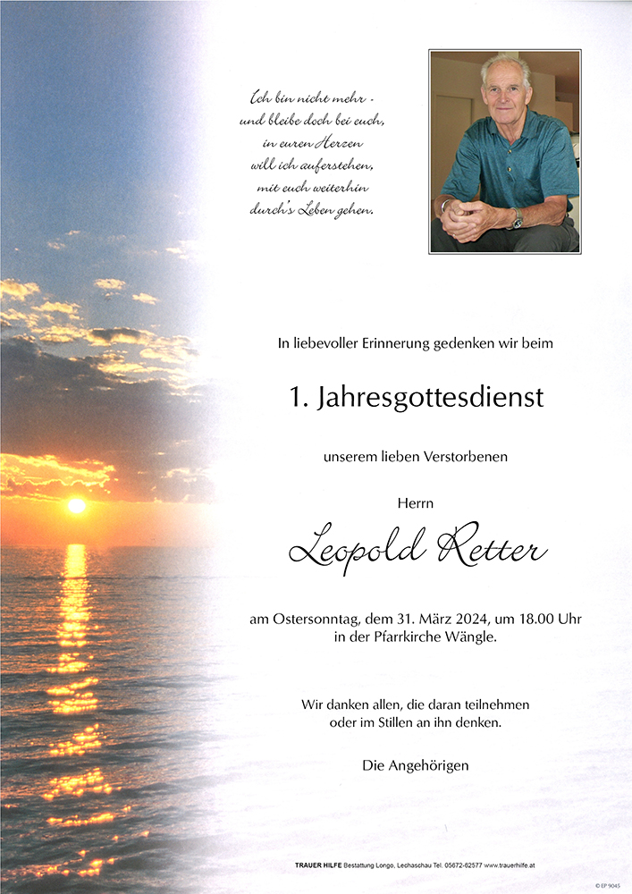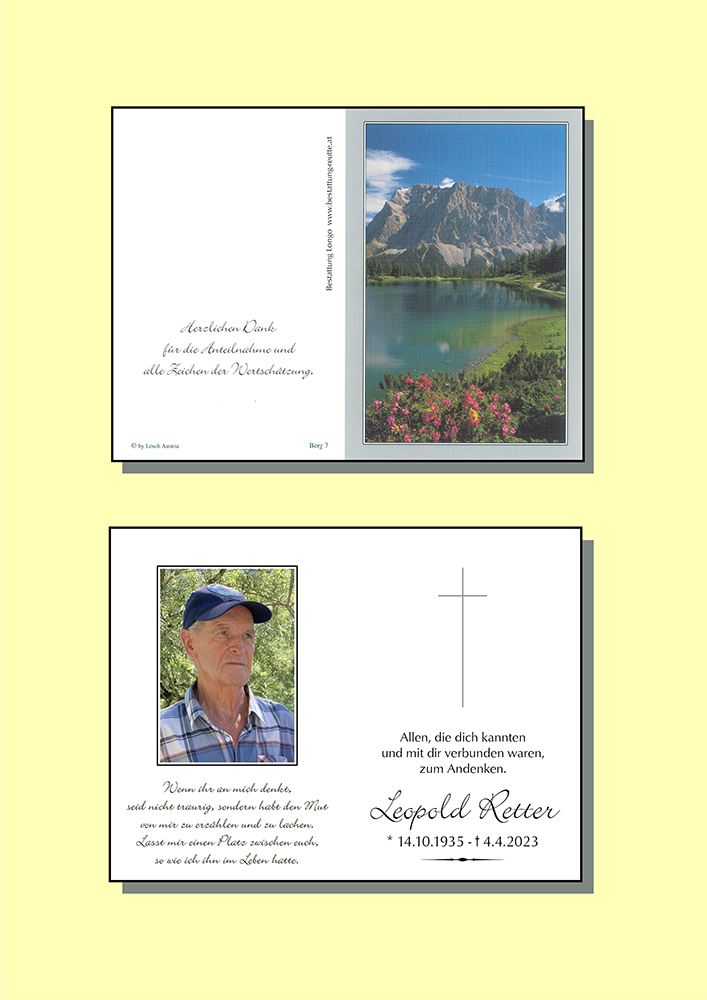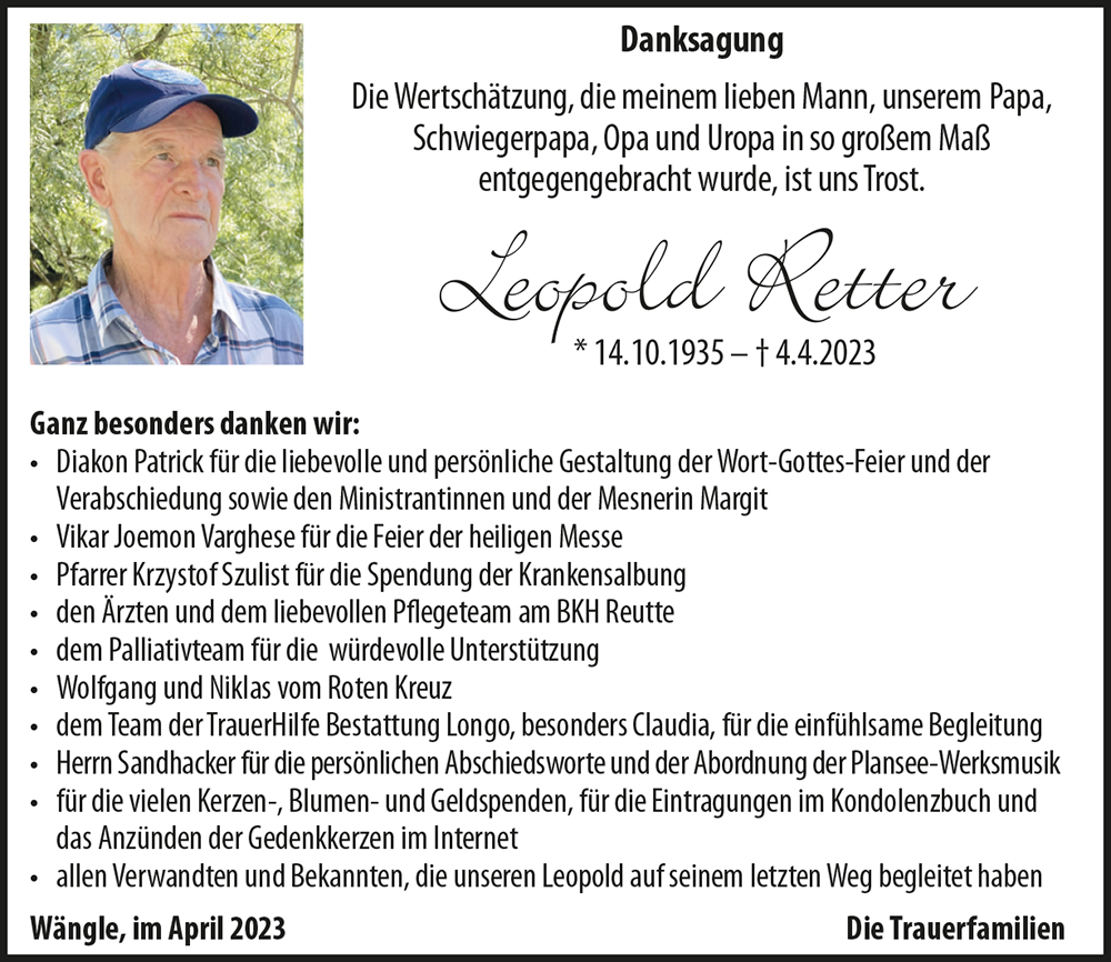 Aufrichtiges Beileid zum schmerzlichen Abschied eines geliebten Familienmitgliedes entbietet Ihnen ein Ihnen unbekannter Retter, der auf der Suche nach den Wurzeln der Retter-Familie auch Wängle fand, wo Retter seit mehr als 500 Jahren leben.