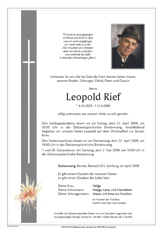13.12.1901 21.04.2009 Breitenwang Leopold Rief Action Parte Gedenkkerzen Kondolenzen Parte Gedenkkerzen Kondolenzen Parte herunterladen Gedenkkerzen für Leopold Rief 4 Einträge Kerze anzünden für dich Leo, Claudia Ruhe in Frieden im Stillen Gedenken Ruhe in Frieden Ihre Gedenkkerze fürLeopold Rief Ihr Name* Farbe auswählen Ihre Nachricht oder Name* E-Mail-Adresse* Mit dem Klicken auf "Kerze anzünden" erklären Sie sich mit unseren Datenschutzbestimmungen einverstanden. Kondolenzbuch für Leopold Rief 0 Einträge Kondolenz verfassen Ihr Abschiedsgruß an Leopold Rief Ihr Name* E-Mail-Adresse* Ihre Nachricht* Mit dem Klicken auf "Gruß absenden" erklären Sie sich mit unseren Datenschutzbestimmungen einverstanden.