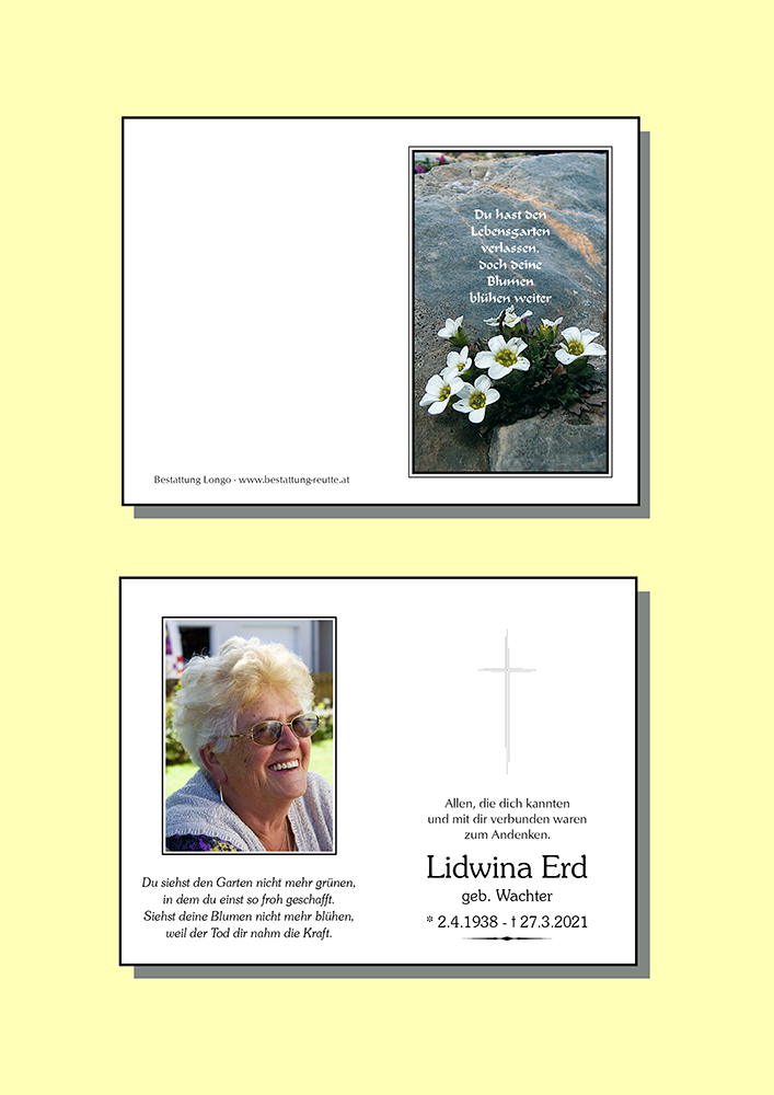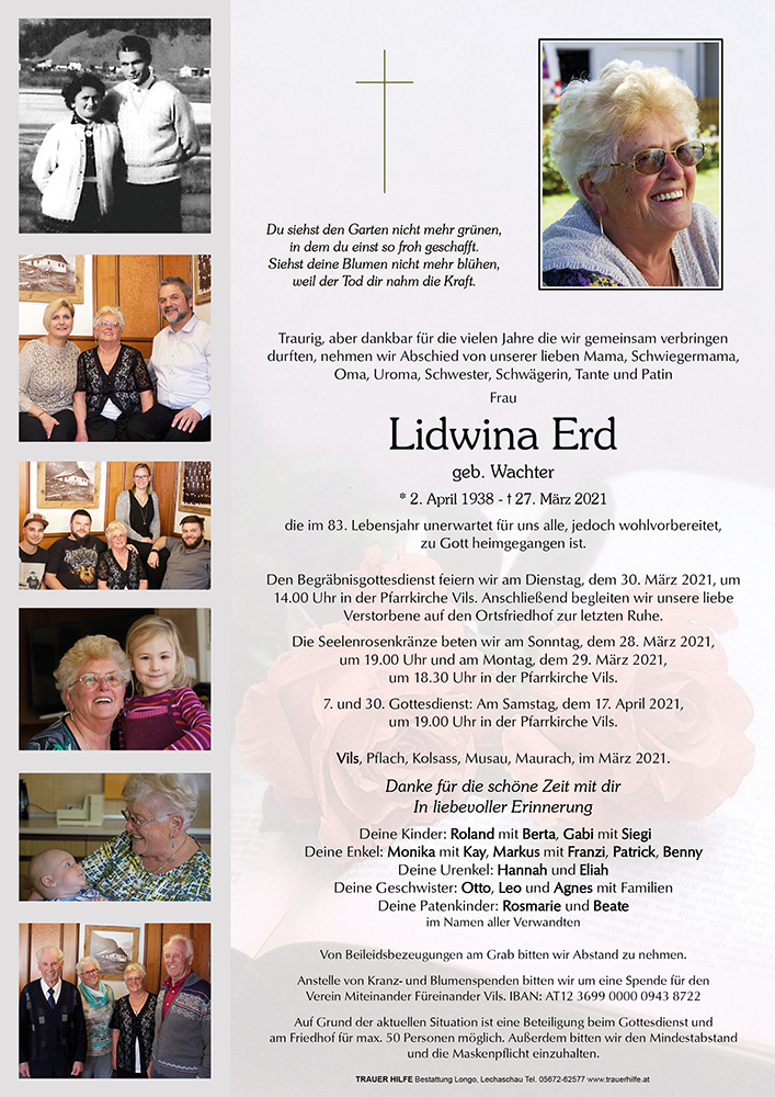 02.04.1938 27.03.2021 Vils Lidwina Erd Action Parte Sterbebild Gedenkkerzen Kondolenzen Parte Sterbebild Gedenkkerzen Kondolenzen Parte herunterladen Sterbebild herunterladen Gedenkkerzen für Lidwina Erd 178 Einträge Kerze anzünden Elmar Ein Licht für deinen Weg-Christine Perle Familie Doser, Musau Ein Licht für deinen Weg-Christine Perle Ein Licht für deinen Weg-Christine Perle Ein Licht für deinen Weg-Christine Perle Ein Licht für deinen Weg-Christine Perle Ein Licht für deinen Weg-Christine Perle Leni Scheucher Ein Licht für deinen Weg-Christine Perle Erich u. Christa Heiserer Ein Licht für deinen Weg-Christine Perle Klaus und Elisabeth Gressl Erich u. Christa Heiserer Ein Licht für deinen Weg-Christine Perle Markus u. Claudia Monitzer Silvia u. Elmar Magdalena Wachter Sigrid Abraham Anita und Roland Steiner Carmen Dirr Anni und Gustl Busslechner Sonja und Günther Köchl Helmut u. Margarete Ostheimer Fam. Gerhard und Kornelia Hohenrainer Ruhe in Frieden Fam. Lanschützer Mitarbeiter ÖAMTC Stp. Reutte Viktoria Schmid ✨ Karin & Wolfgang Müller Alexander Ammann Fam. Hans Obristhofer Roland und Gabi Beirer Mali + Horst Meindel Annemarie Tröber Rosemarie u. Ewald Taferner Michael & Ulli Erd Fam. Dagmar und Andreas Kerle Fam Andy u. Klaudia Inwinkl Roth Wolfgang und Lisi Anita und Helmut Frick Dein Patenkind Beate mit Christoph Marianne & Peter Schautzgy Andreas Djeric Fam. Gritsch Jürgen Andrea Abraham Claudia Klaunzer Ruhe in Frieden, Zenta u Christine Michael Mutschlechner Roswitha und Isolde Ingrid und Gitti dreer Fam. Angelika Roth Manfred u. Uschi Megele Fam. Lechleitner Egon Fam. Lechleitner Egon Fam. Lechleitner Egon Maria Beyrer Musau Martha Wiesinger Adolf Götsch Fam. Guido Galley Gerd & Carola m. Familie Ruhe in Frieden. Deine Cousine Leni Scheucher Ruhe in Frieden Fini Lochbihler Fam. Anja u. Christian Saurer Max & Karin Mellauner Walburga & Josef Dürrhammer Familie Mina Stürzl Karner Ingrid Ernst und Marlene Keller Schretter Roland mit Fam. Charlaine, Tamara und Roland Anna Keller Schretter Irmgard und Siegfried Werner und Gabi Wiesinger Carmen u. Peter Mantl Ulli u. Karl Gigl Fini u. Helmut Fam. Heribert & Anni Bailom Hedi und Edwin Angelika, Julia, Christina, Andi und Christl Fam. Paul Vogler Erich u. Christa Heiserer Leopold u. Silvia Wörle Dagmar Hummel Fam. Berwanger Walter Fam. Fritz &Ursula Geyeregger Pius und Herta Lachmair In stillem Gedenken Richard Wasle Rudolf Pürcher Friedrich Bubendorfer Hannelore Lochbihler Fam. Stefan Beirer Gerlinde Haunsberger Gerhard u. Annelies Steurer Manfred u. Annelies Wachter Traudl Höfling Susanne & Klaus Dirr Carmen Strigl-Petz m. Familie Hannelore Hosp Reinhold Heiserer Norbert mit Familie Fam. Engelbert Ostheimer Heidi Schneier ein Licht für die Ewigkeit Karl und Ingrid Mages Letzter gruss Annabell + Charly Mario und. Barbara Rief SCHEIBER WALTER Fam. Kastner René Mitzi Brigitte Wachter Annelies und Klaus Singer Annelies und Klaus Singer Annelies und Robert Heiserer Elsa u Willi Kaiser Edith und Tamara Moore Willi & Lydia m. Familie Carmen Kaiser mit Familie Martin Immler Silvia u. Elmar Beirer Familie Krepler Fam. Georg u. Rita Gruber Fam. Rudi & Erika Petz Mantl Gabi Michael Moore Bruno HAUG Alfred & Melitta Ginther Fam. Markus & Michaela Blondeel Hanni & Franz Kögl Familie Armin Megele Hildegard Schmidhofer Manfred & Trixi Kerber Daniela Beirer Geri Immler mit Familie Leopold und Petra Vogler Melanie Hummel und Johann Triendl Fam. Marion Ostheimer Dagmar Hummel Ruhe in Frieden Margaretha Erd Carola&Reini mit Tobias&Manuel Fam. Alfred Oberhollenzer Fam. Klaus & Christiane Huter Martin & Heike Gassmann "Miteinander-Füreinander" Luisi Gassmann Anita Ostheimer Ein Licht für deinen Weg-Christine Perle Karin Schretter Fam. Elisabeth und Siegfried Amann Fam. Günter&Gitti Mugllach Dietmar u. Ulli Hosp Fam. Martin &Simone Petz Fam. Irene & Markus Rachbauer Bernhard & Conny Strigl Otto und Dari, Helene und Sophia Agnes und Josef Vogler Alexandra Thurner Gisela u. Pepi Gschwend Haselwanter Erwin u Sonja Beatrix Monitzer Ilse u. Armin Erd Dalmonego Eleonore Fam. Markus Triendl Fam Fam. Paul und Annemarie Kaiser Unser herzliches Beileid! Ingrid und Adi Familie Pitterle Ein Licht für Dich Gustl Ihrenberger Sonja u. Michael Pumeneder Arthur Hosp und Fini Marga Hackl Breitenwang Christoph Hosp Fam. Leitner, Pflach Ingrid u. Gebhard Lorenz Claudia Schreieck TrauerHilfe Bestattung Longo Ihre Gedenkkerze fürLidwina Erd Ihr Name* Farbe auswählen Ihre Nachricht oder Name* E-Mail-Adresse* Mit dem Klicken auf "Kerze anzünden" erklären Sie sich mit unseren Datenschutzbestimmungen einverstanden. Kondolenzbuch für Lidwina Erd 1 Eintrag Kondolenz verfassen Wir sind nur Gast auf Erden und wandern ohne Ruh‘ mit mancherlei Beschwerden der ewigen Heimat zu. Ruhe in Frieden 28.03.2021 um 16:22 Uhr Ihr Abschiedsgruß an Lidwina Erd Ihr Name* E-Mail-Adresse* Ihre Nachricht* Mit dem Klicken auf "Gruß absenden" erklären Sie sich mit unseren Datenschutzbestimmungen einverstanden.