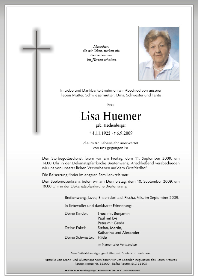 13.12.1901 06.09.2009 Breitenwang Lisa Huemer Action Parte Gedenkkerzen Kondolenzen Parte Gedenkkerzen Kondolenzen Parte herunterladen Gedenkkerzen für Lisa Huemer 0 Einträge Kerze anzünden Ihre Gedenkkerze fürLisa Huemer Ihr Name* Farbe auswählen Ihre Nachricht oder Name* E-Mail-Adresse* Mit dem Klicken auf "Kerze anzünden" erklären Sie sich mit unseren Datenschutzbestimmungen einverstanden. Kondolenzbuch für Lisa Huemer 0 Einträge Kondolenz verfassen Ihr Abschiedsgruß an Lisa Huemer Ihr Name* E-Mail-Adresse* Ihre Nachricht* Mit dem Klicken auf "Gruß absenden" erklären Sie sich mit unseren Datenschutzbestimmungen einverstanden.