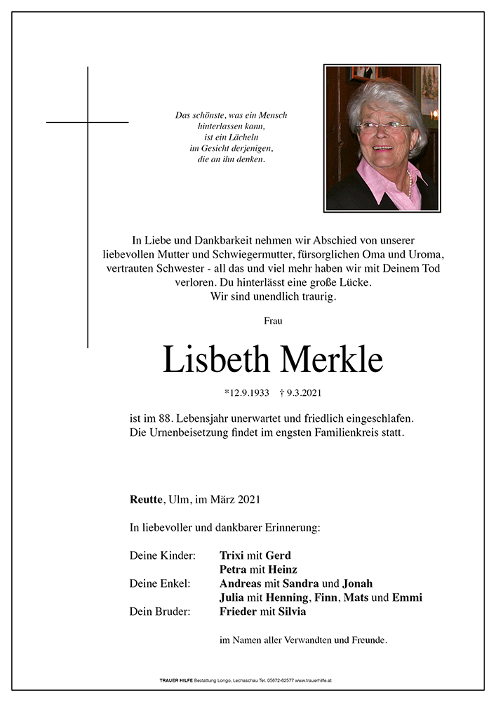 Liebe Trixi und Trauerfamilie! War Jahrelang eine Nachbarin in der Lindenstraße! Habe eure herzallerliebste Mama kennen und schätzen gelernt. Sie war eine so nette Frau und hatte immer ein Lächeln parat. Werde sie nie vergessen und jedesmal wenn ich am ( alten Haus) vorbeifahre werd ich an sie denken. Sie bleibt unvergessen. In stiller Trauer : Sabine Walch
