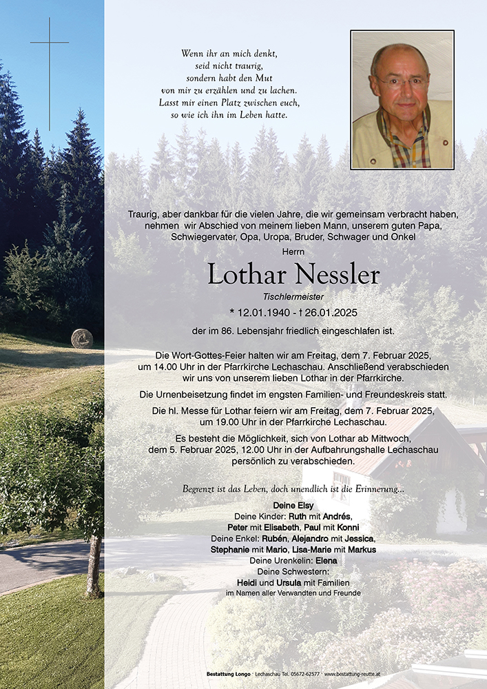 es gibt eine Zeit der Stille und der Trauer und es gibt eine Zeit der dankbaren Erinnerung. Jahrzehnte war Lothar ein treues und verlässliches Mitglied der Handwerks/-Zunftbruderschaft St. Josef zu Bichlbach. Wir behalten Lothar in dankbarer Erinnerung und werden ihm ein ehrendes Andenken bewahren.