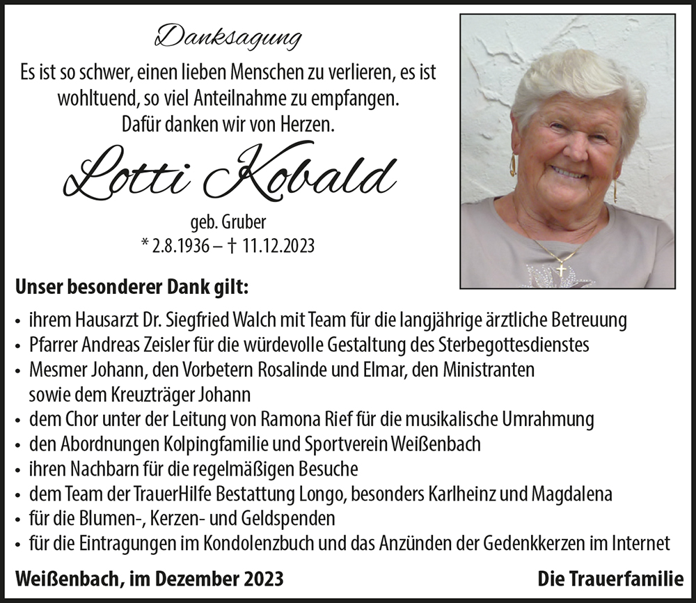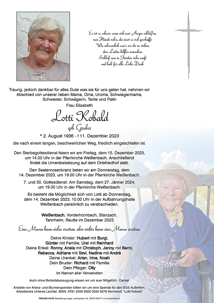 Zum Ableben von Lotti möchten wir unser tiefes Mitgefühl ausdrücken. Lotti war langjähriges Mitglied des Pensionisten-verbands Österreich - Ortsgruppe Weissenbach. Als Musikliebhaberin war sie begeisterte Teilnehmerin bei unseren Treffen.