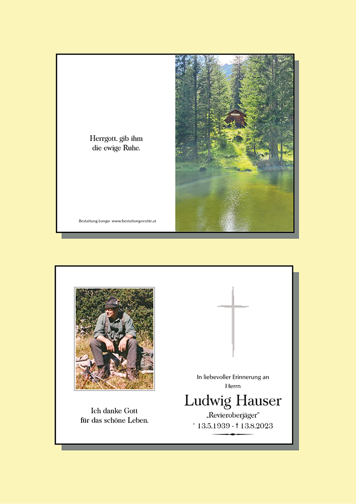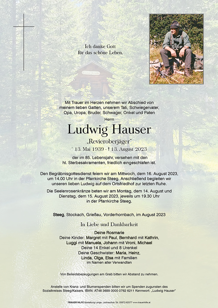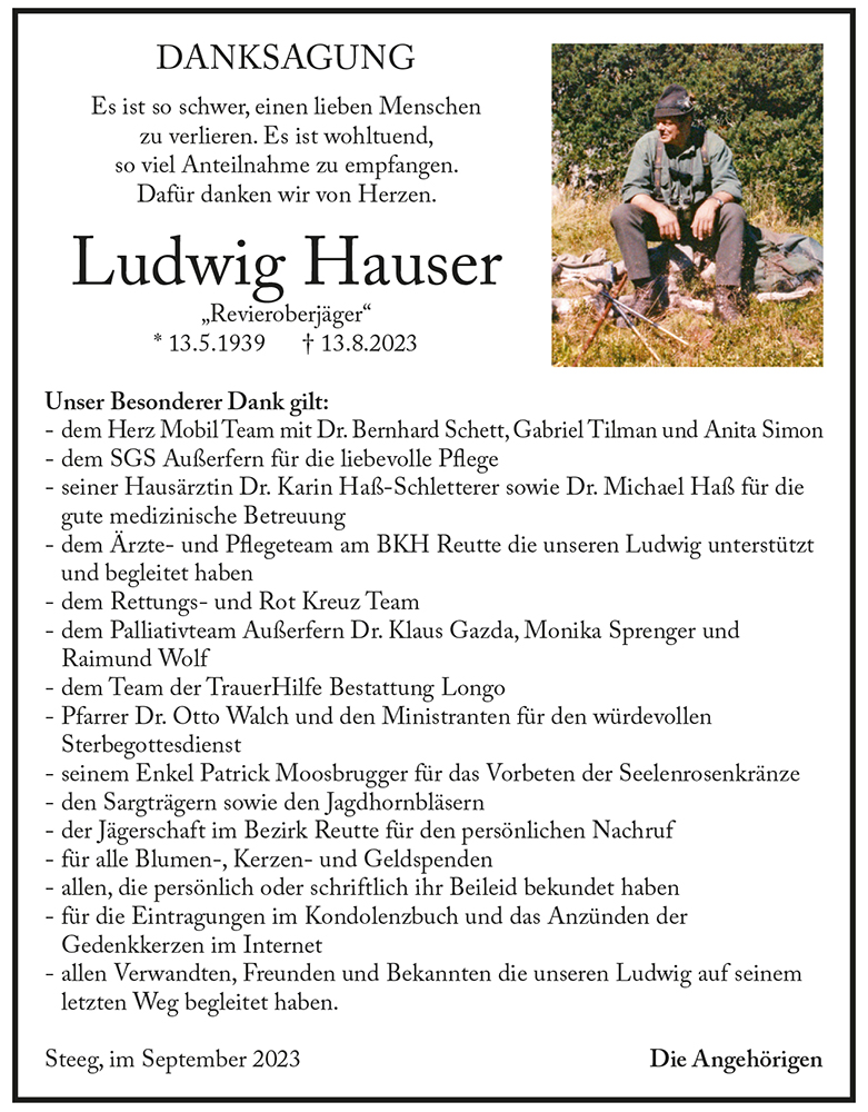 Der Jagdschutzverein 1875 Bezirksgruppe Reutte, verabschiedet sich von Revieroberjäger Ludwig Hauser, einem Jahrzehntelangen treuen Vereinsmitglied, einem profunden Jäger und einem wunderbaren Menschen mit einem letzten " Weidmanns Dank" und " Weidmanns Ruh "