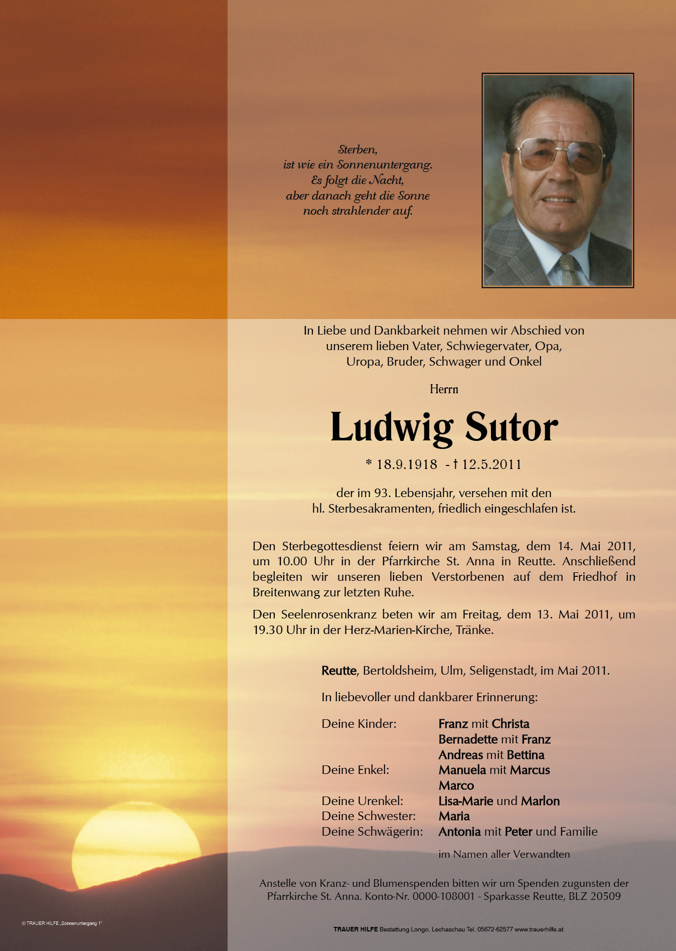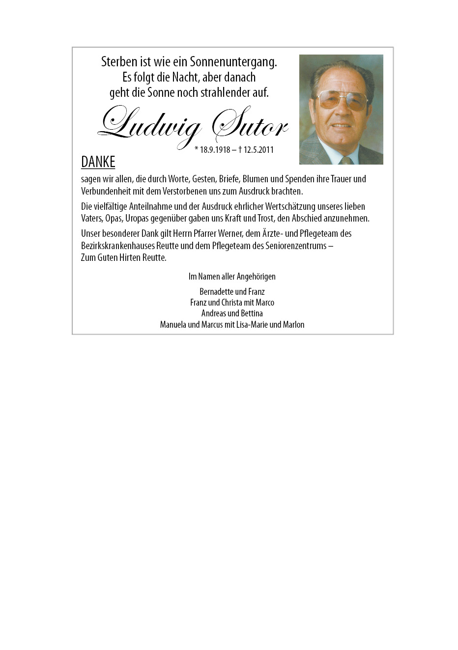 13.12.1901 12.05.2011 Reutte Ludwig Sutor Action Parte Sterbebild Gedenkkerzen Kondolenzen Danksagung Parte Sterbebild Gedenkkerzen Kondolenzen Danksagung Parte herunterladen Sterbebild herunterladen Gedenkkerzen für Ludwig Sutor 4 Einträge Kerze anzünden Frischmann Walter & Irma Fam. Kößler Werner u. Karin Ruhe in Frieden Gabi, Marlen, Michael & Christa Ihre Gedenkkerze fürLudwig Sutor Ihr Name* Farbe auswählen Ihre Nachricht oder Name* E-Mail-Adresse* Mit dem Klicken auf "Kerze anzünden" erklären Sie sich mit unseren Datenschutzbestimmungen einverstanden. Kondolenzbuch für Ludwig Sutor 0 Einträge Kondolenz verfassen Ihr Abschiedsgruß an Ludwig Sutor Ihr Name* E-Mail-Adresse* Ihre Nachricht* Mit dem Klicken auf "Gruß absenden" erklären Sie sich mit unseren Datenschutzbestimmungen einverstanden. Danksagung herunterladen