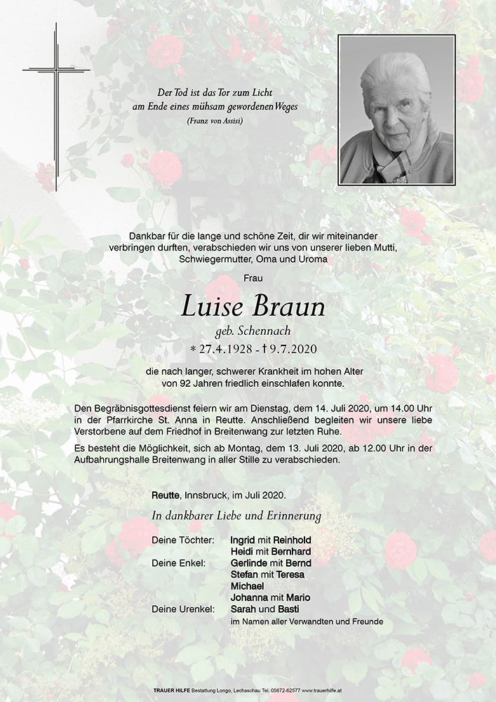 Zum Verlust von Eurer Lieben Luise möchten wir Euch unser aufrichtiges Beileid und tiefes Mitgefühl aussprechen.