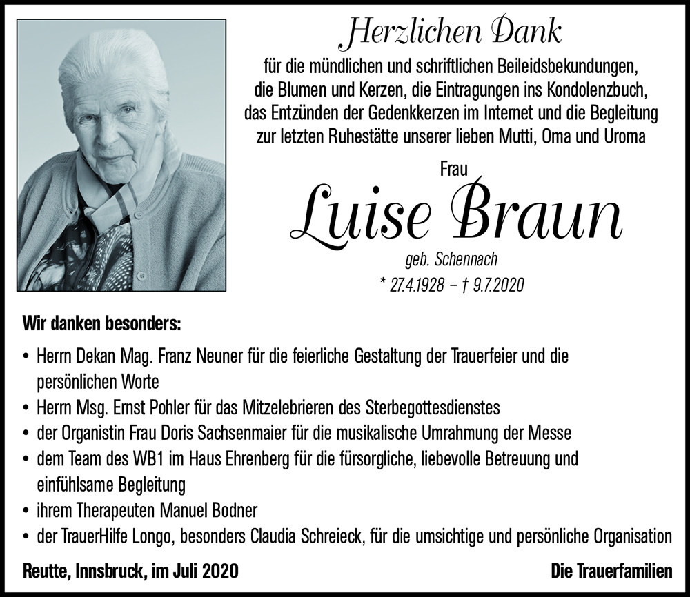 wir denken an Luise und an viele schöne Begegnungen. Damit verbundene Erinnerungen lassen Luise aufleben und Freude aufkommen.
