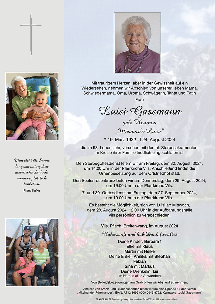 Trauert gemeinsam und erinnert euch an die schönsten Stunden in denen ihr mit eurer Mama Luisi zusammen ward, denn in euren Erinnerungen bleibt ihr Mama Luisi verbunden.