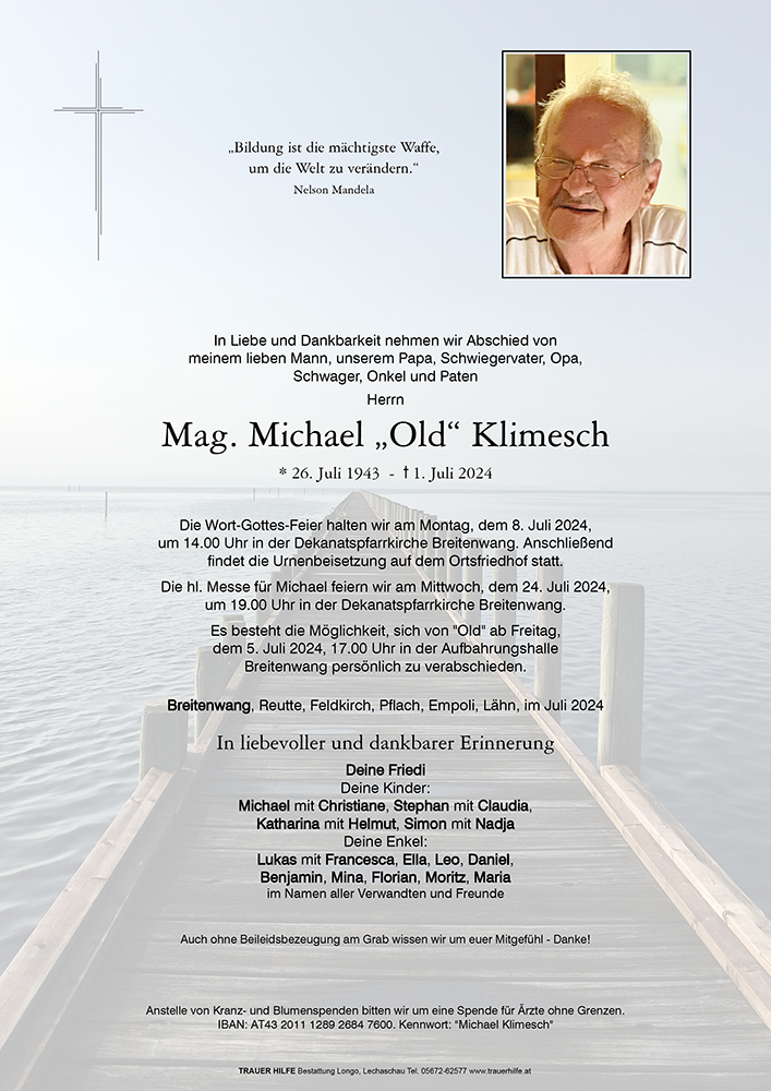 Wir hoffen, dass es für alle in den schweren Stunden des Abschieds ein Trost ist zu wissen, dass Herr Mag. Klimesch bei uns und in der Erinnerung der Absolventinnen und Absolventen unserer Schulen einen festen Platz haben wird.