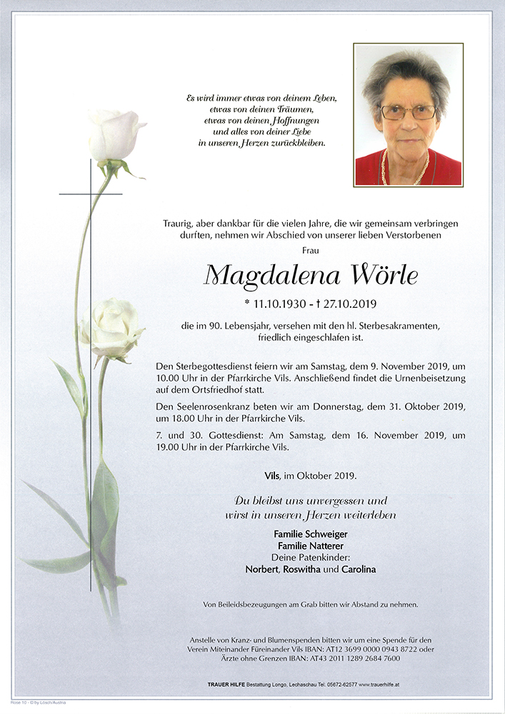11.10.1930 27.10.2019 Vils Magdalena Wörle Action Parte Sterbebild Gedenkkerzen Kondolenzen Parte Sterbebild Gedenkkerzen Kondolenzen Parte herunterladen Sterbebild herunterladen Gedenkkerzen für Magdalena Wörle 96 Einträge Kerze anzünden In stillem Gedenken Kathl und Ludwig Simone In stillem Gedenken Kathl und Ludwig Ruhe in Frieden Fam. Geyeregger In stillem Gedenken Hab\'s fein im Himmel ⭐⭐⭐ Karl und Ingrid Mages Kurt und Anita Ostheimer Fam. Erich Tscharnuter Sieglinde Woerle In stillem Gedenken Kathl und Ludwig Helmut u. Margarete Ostheimer Peter u. Renate Petz Markus u. Claudia Monitzer Flo Anita und Helmut Frick Marina mit Familie Ruhe in Frieden Petra G. Silvia holzknecht Marianne Schautzgy Michaela Leuprecht (Schmid) Fam. Gassmann Burgi u. Hans Obristhofer Susanne & Klaus Dirr Fam. Bert Wörle Erika u. Helmut Lewisch Doris mit Familie Fam. Silvia Presslauer Barbara Schweißgut Melitta Ginther Claudia und Stephanie mit Familie Miteinander-Füreinander Fam. Klaus&Christiane Huter Marlene und Kurt Lachmair Ulli mit Familie Fam. Sieglinde Schmitt-Lochbihler Karin Schretter Fam. Paulsteiner aus Pinswang Beate und Max Gerle Ilse u. Armin Erd Fam. Lochbihler Kurt Eine Kerze aus Reutte Claudia Klaunzer Nadja Mayer Ein Licht für die Reise Hedi und Edwin Bettina u Walter Ahorn Leopold u. Silvia Wörle MartinundSimonePetz Heidi Singer Gerhard u. Annelies Steurer Andrea Bader Fam. Pius u. Herta Lachmair Bernhard & Conny Strigl Fritz Bubendorfer Ruhe in Frieden Freiderike Oberbreyer In stillem Gedenken Richard Wasle Beatrix Monitzer Arthur Hosp und Fini Haus Ehrenberg Wohnbereich 2 Ruhe in Frieden Fam. Geyeregger Elsa und Willi Kaiser Alois Gratl Das Team des SGS Außerfern Köchl Sonja und Günther Georg u. Monika Vogler Andrea Harnos Ruhe in Frieden Angelika Roth & Kinder ELMAR ISENBURG Ruth Isenburg Familie Perle Rita Gruber Marina Hopfgartner Ernst & Marlene Keller Isolde, Anika und Rene Roswitha Wörle Ingrid und Adi Beirer Barbara u. Mario Rief Wolfgang und Lisi Roth Ingrid u. Gebhard Lorenz Leni, sei geborgen bei Gott Max & Karin Mellauner Fam. Erika & Rudi Petz Sabine Pitterle Fam. Michael Erd Tröber Annemarie Mali + Horst Meindel Mali + Horst Meindel Julia Gruber Annabell m Fam Pürcher Rudolf Helga Schnitzlbaumer Kathrin, Markus und Lena Claudia Schreieck TrauerHilfe Bestattung Longo Ihre Gedenkkerze fürMagdalena Wörle Ihr Name* Farbe auswählen Ihre Nachricht oder Name* E-Mail-Adresse* Mit dem Klicken auf "Kerze anzünden" erklären Sie sich mit unseren Datenschutzbestimmungen einverstanden. Kondolenzbuch für Magdalena Wörle 0 Einträge Kondolenz verfassen Ihr Abschiedsgruß an Magdalena Wörle Ihr Name* E-Mail-Adresse* Ihre Nachricht* Mit dem Klicken auf "Gruß absenden" erklären Sie sich mit unseren Datenschutzbestimmungen einverstanden.