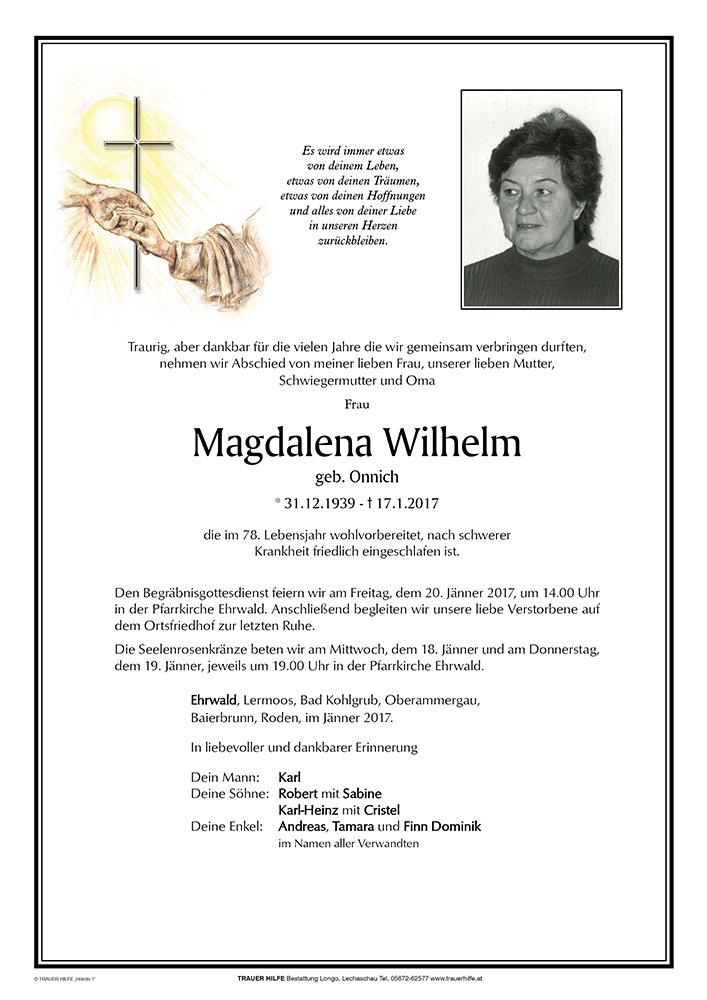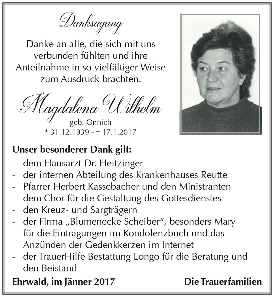 Aufrichtige Anteilnahme entbieten Inge Wilhelm und Söhne