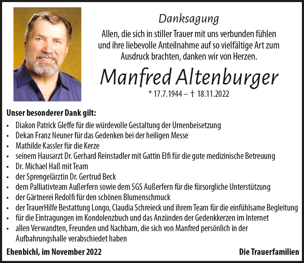 Aufrichtige Anteilnahme entbietet Das Team der Dorfbäckerei Laden Ehenbichl Waltraud Umshaus 21.11.2022 um 13:46 Uhr
