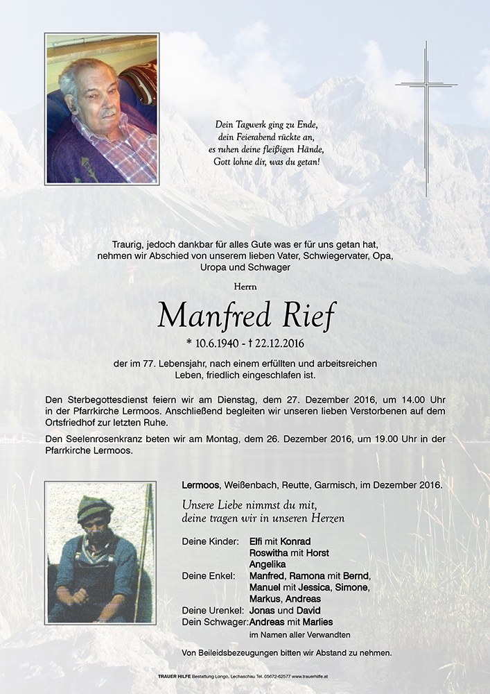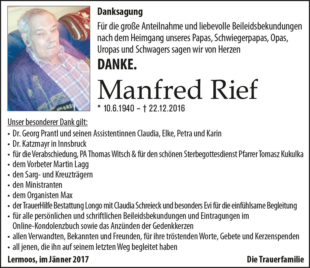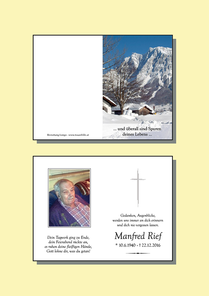 meine Worte werden wohl kaum im Stande sein, eure Trauer über den Verlust eines geliebten Menschen zu lindern. Möge der Schmerz euch nicht erdrücken und die Erinnerungen an die gemeinsame Zeit euch genügend Kraft für die Zukunft geben. Er ist zwar nicht mehr bei euch, doch ihr werdet ihm täglich begegnen. Das Lächeln, das er euch schenkte, seine helfenden Worte und alles, was er für euch getan hat, wird euch ein Leben lang begleiten. Liebe, Achtung und Erinnerung bleiben für immer!