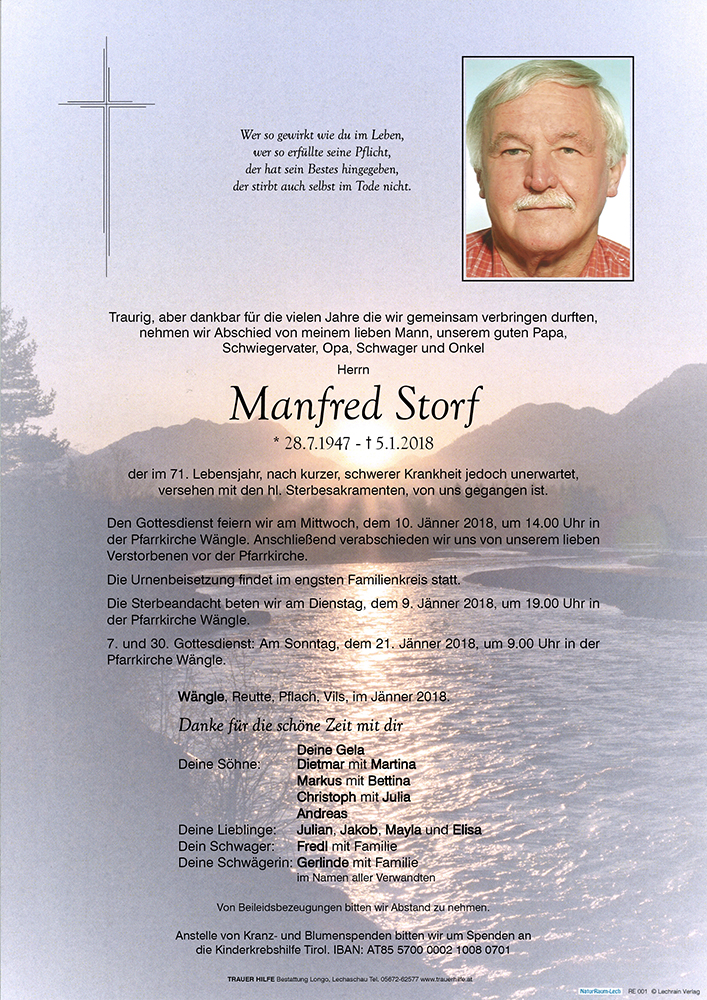 Auf diesem Wege möchte ich den Trauerfamilien meine tiefe Anteilnahme am unerwarteten Tod eures lieben Manfred aussprechen. Er war mir ein geschätzter Musikkamerad bei der Harmoniemusik Lechaschau.