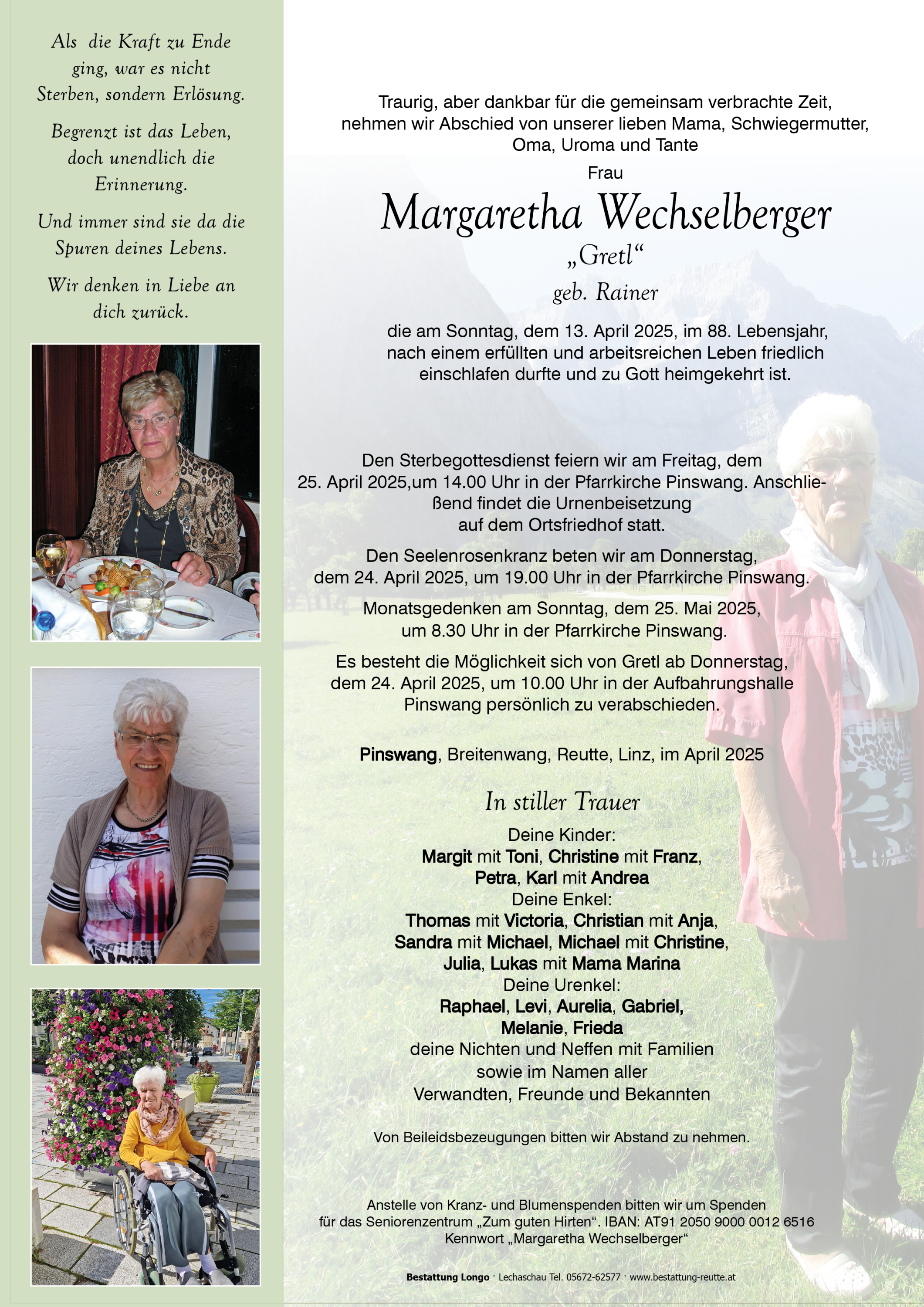 Kondolenzbuch für Margaretha "Gretl" Wechselberger
