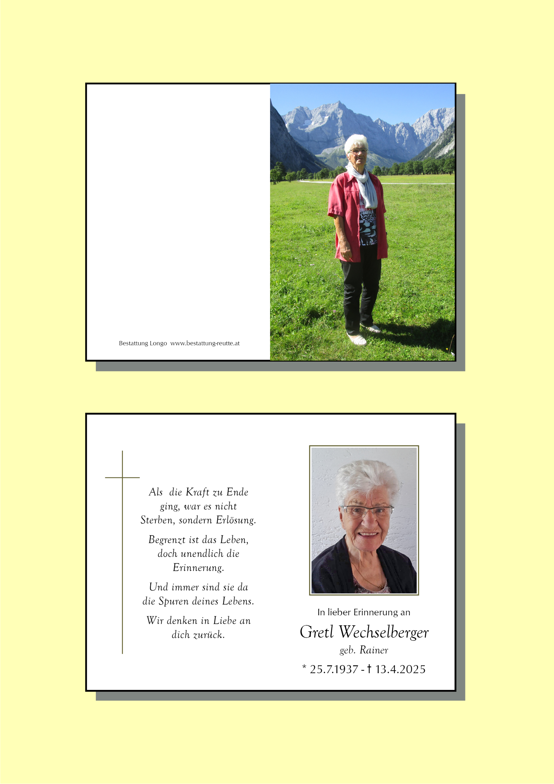 Gretl wird immer einen Platz in meinem Herzen haben. Trotz einiger Schicksalsschläge verlor sie nie ihren Lebensmut und ließ sich nicht aus ihrer Lebenspur bringen. Ihr ganzes Leben lang war sie da für andere. Sie war glücklich, wenn sie helfen konnte. Gretl war gesellig und genoss die Gemeinschaft mit ihren Freundinnen. Eine ihrer großen Leidenschaften war das Reisen.